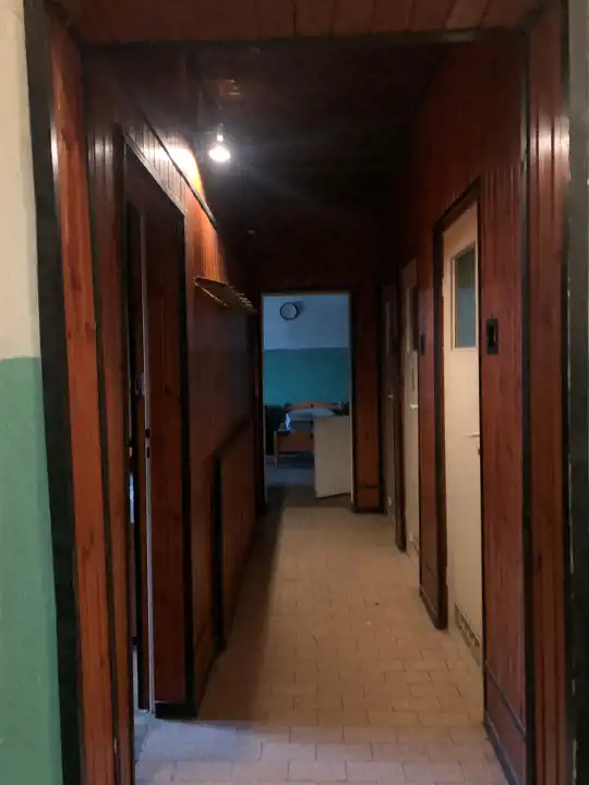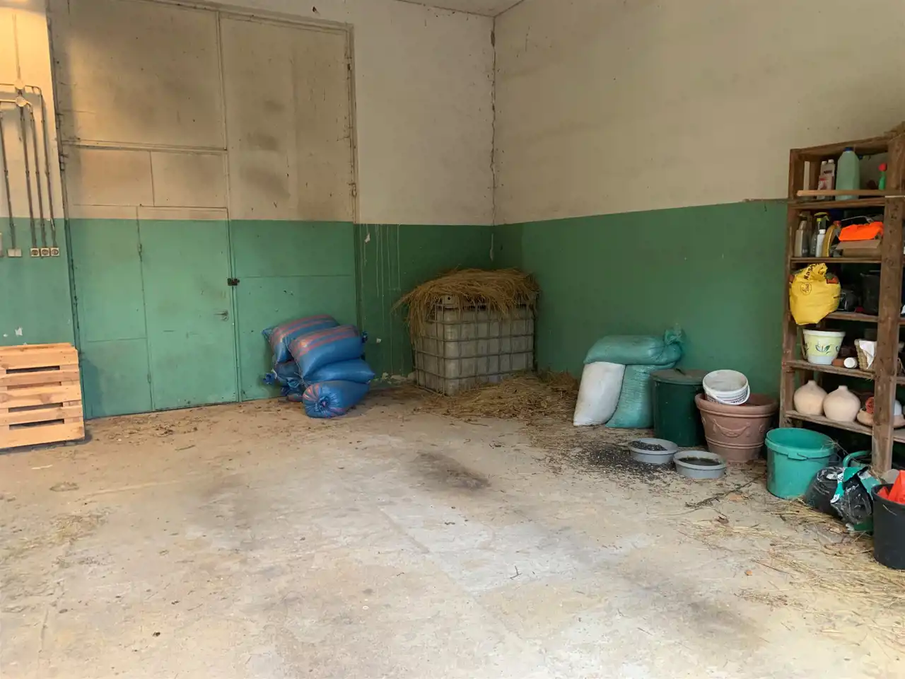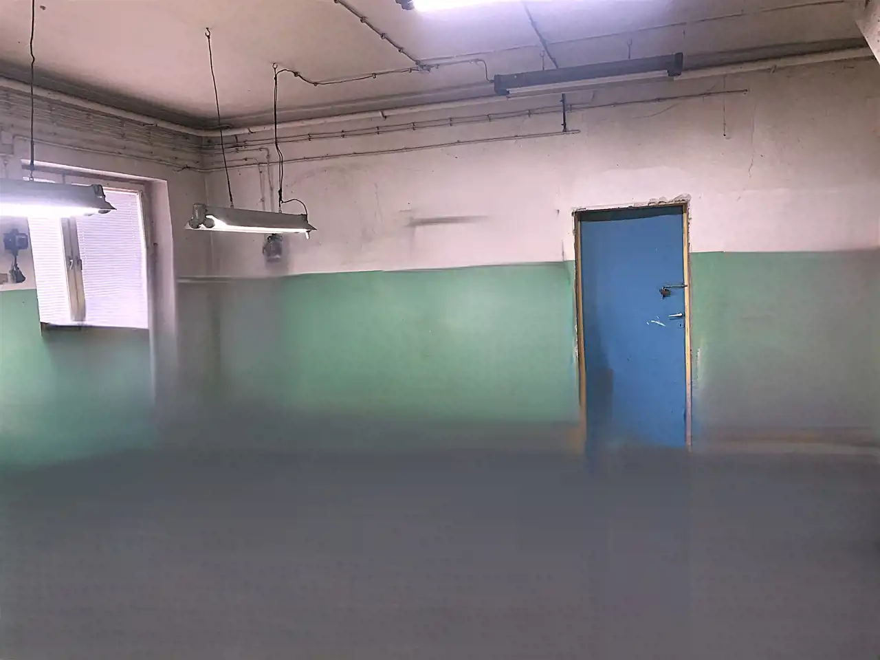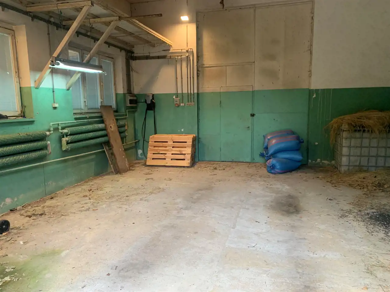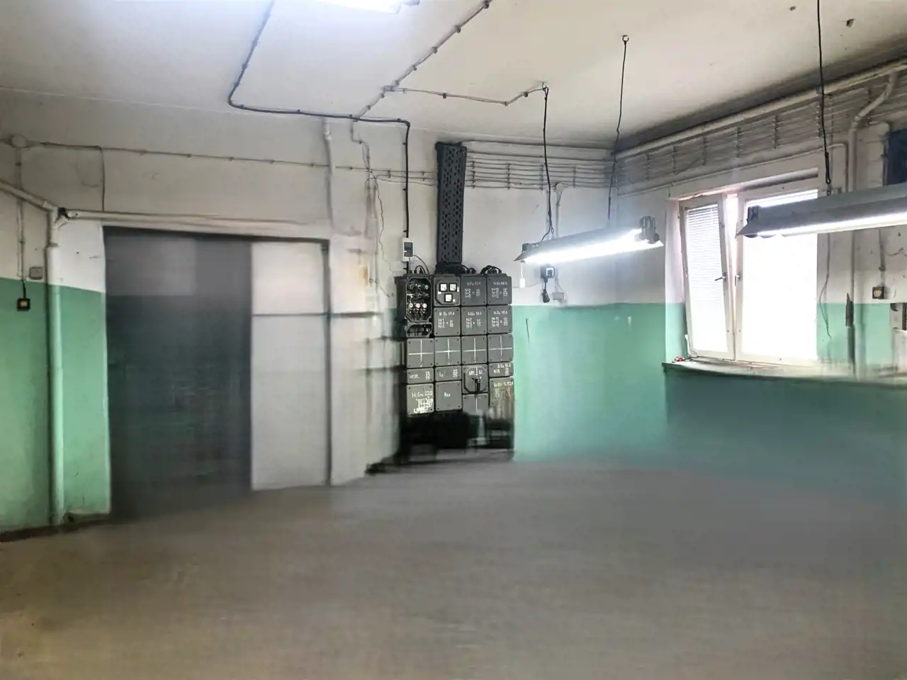 Trzecie pomieszczenie ma wymiary 5,75m x 6,5m i jest w nim wejście schodami na piętro do części biurowej budynku (posiada także bramę o wymiarach wewnątrz ościeżnicy 2,83m x 2,9m). Z korytarza jest wejście do wszystkich pomieszczeń: 31m2, 24m2 ( to pełniło funkcję pomieszczenia socjalnego- doprowadzona woda i kanalizacja) i 13,5m2, a także do łazienki 3,1m2 i 2 toalet.