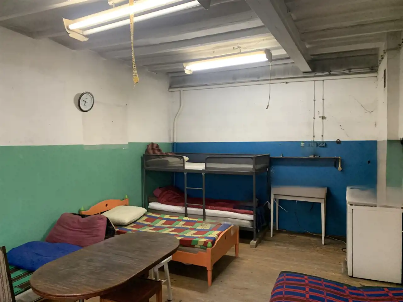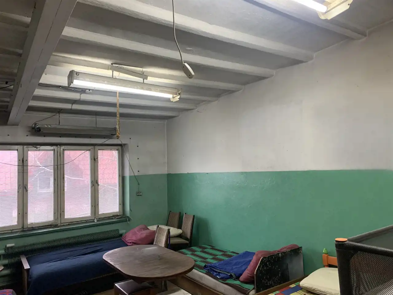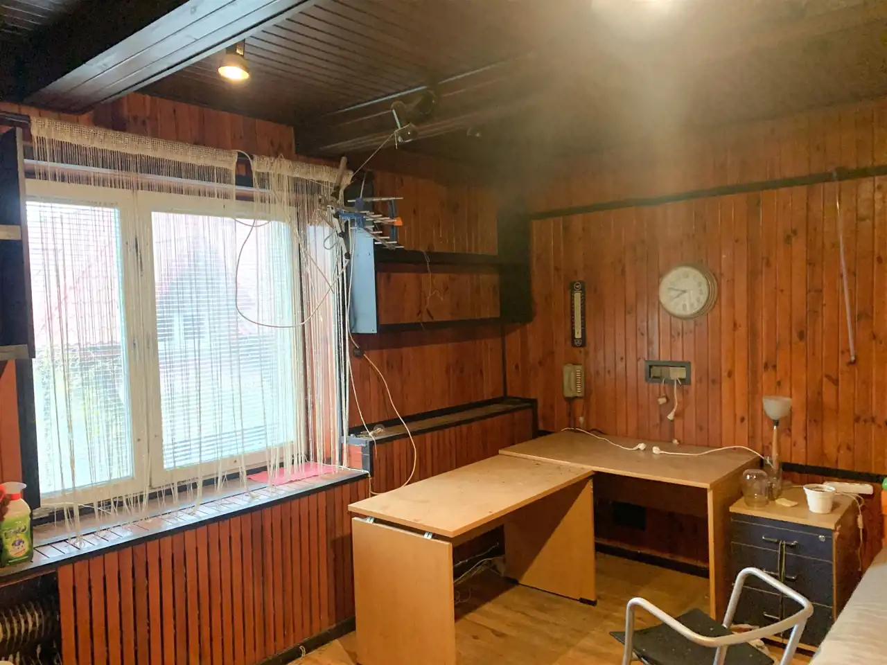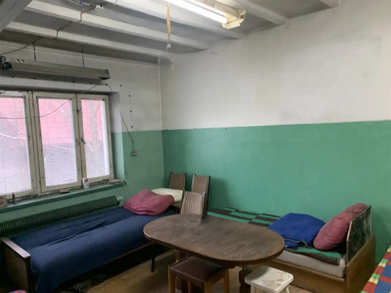 Trzecie pomieszczenie ma wymiary 5,75m x 6,5m i jest w nim wejście schodami na piętro do części biurowej budynku (posiada także bramę o wymiarach wewnątrz ościeżnicy 2,83m x 2,9m). Z korytarza jest wejście do wszystkich pomieszczeń: 31m2, 24m2 ( to pełniło funkcję pomieszczenia socjalnego- doprowadzona woda i kanalizacja) i 13,5m2, a także do łazienki 3,1m2 i 2 toalet.