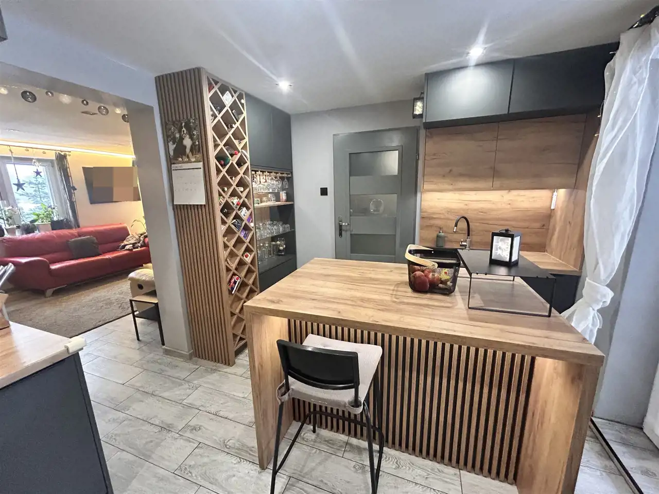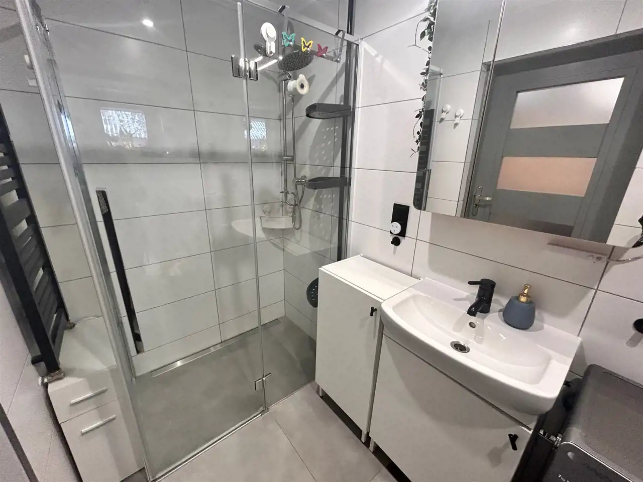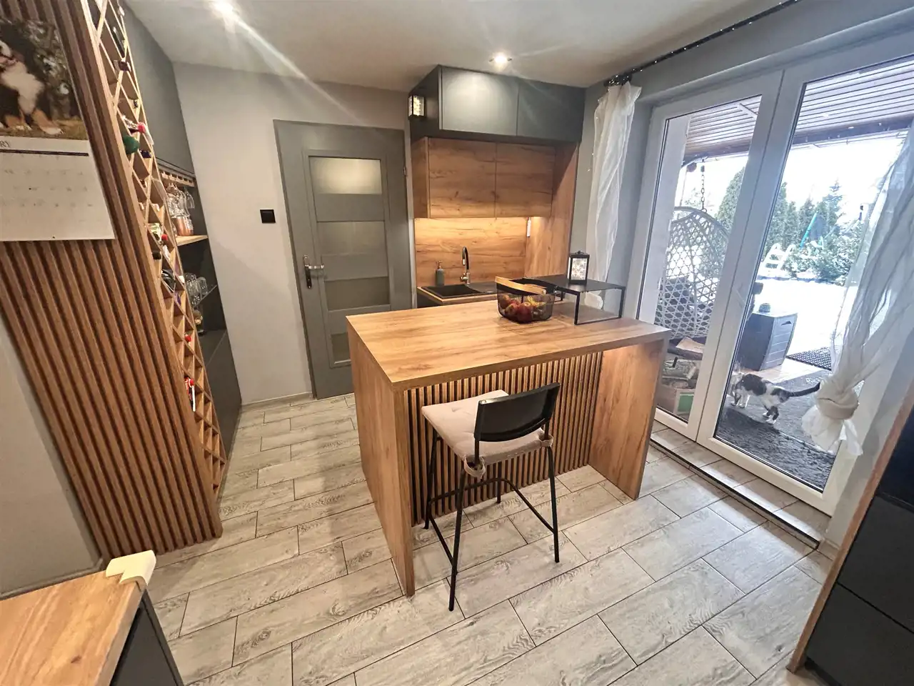 Salon jest duży i przestronny, na podłodze znajdują się panele, na ścianach gładzie. Dodatkowo w salonie znajduje się kominek, dzięki czemu jest bardzo przytulnie. W sypialni na podłodze położone zostały panele, na ścianach gładzie. Na przedpokoju położone na podłodze panele, na ścianach gładź pokryta powłoką malarską. Łazienka wyposażona w kabinę prysznicową oraz miskę WC ze stelażem podtynkowym, na ścianach i podłodze płytki gresowe. W kuchni na podłodze znajdują się płytki gresowe, na ścianach gładź pokryta powłoką malarską oraz panele drewniane w pasie roboczym. Kuchnia wyposażona w nowoczesną zabudowę kuchenną wraz ze sprzętem AGD (lodówka, płyta gazowa, piekarnik elektryczny, okap, zmywarka, mikrofalówka).