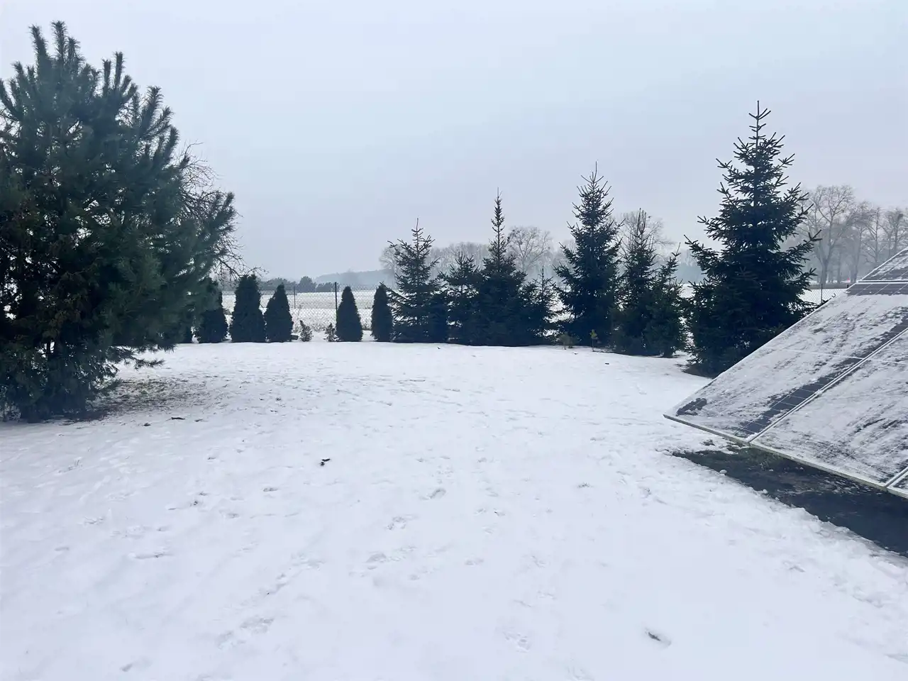 Tył posesji pokryty trawą, na działce znajduje się kilka drzew, od frontu posadzono duże choinki, dzięki czemu nie widać posesji z drogi.