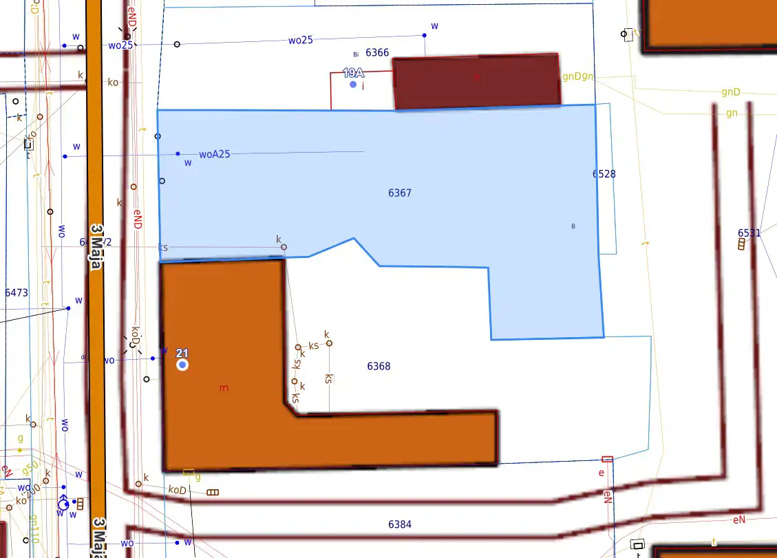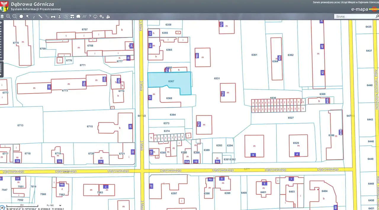 Działka budowlana usytuowana w Dąbrowie Górniczej, przy ulicy 3 Maja o aktualnym oznaczeniu MWU, zgodnie z miejscowym planem zagospodarowania przestrzennego działka objęta jest terenem zabudowy mieszkaniowej wielorodzinnej i usługowej. Z przeznaczeniem podstawowym do zabudowy mieszkaniowej wielorodzinnej, do zabudowy usługowej, administracyjno-biurowej, handlu detalicznego, usług konsumpcyjnych, parkingi oraz parkingi wielopoziomowe.
