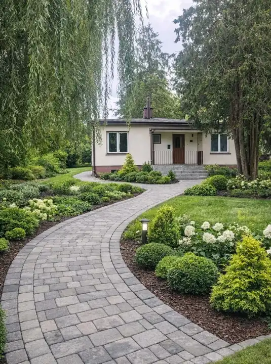 - Działka zagospodarowana m.in. przed domem - krzewami ozdobnymi, natomiast za garażem rozprzestrzenia się duży sad owocowy.