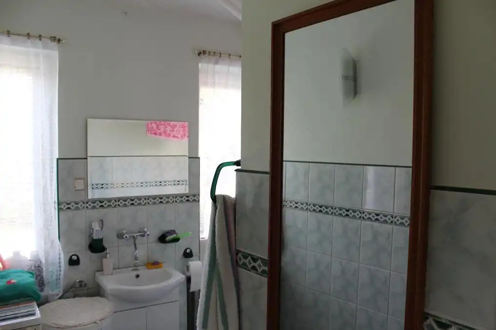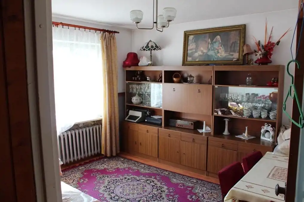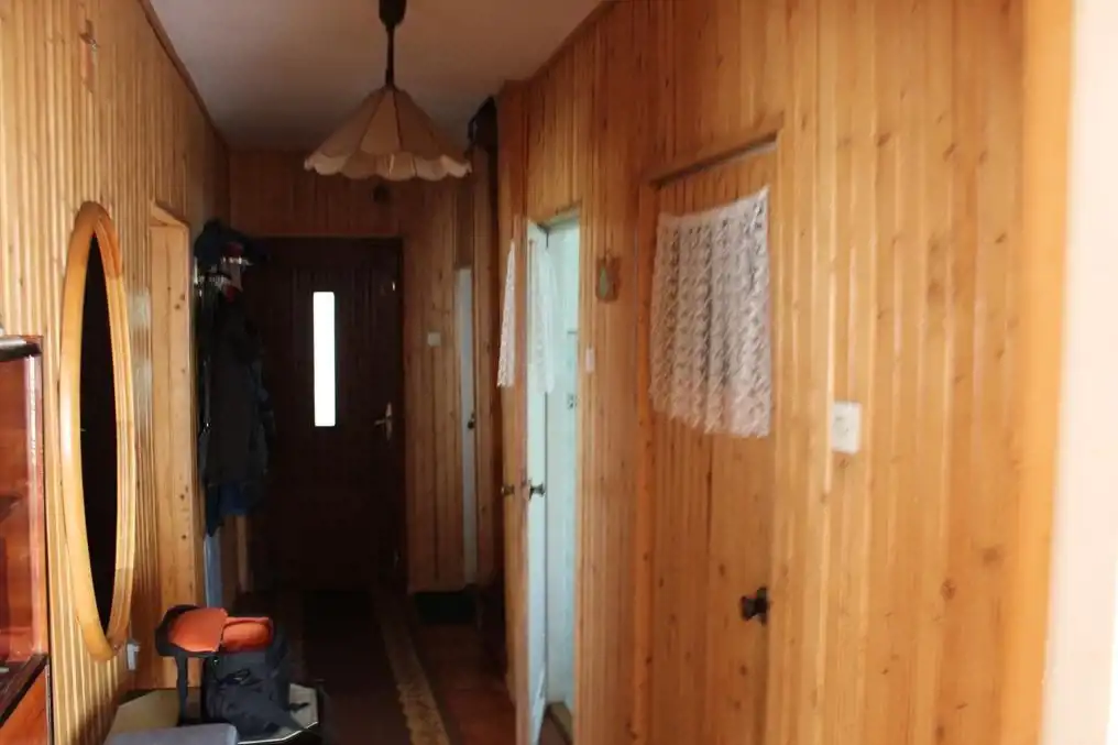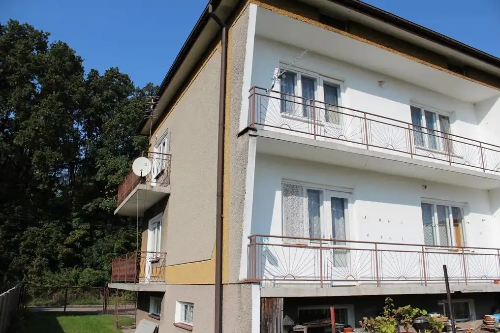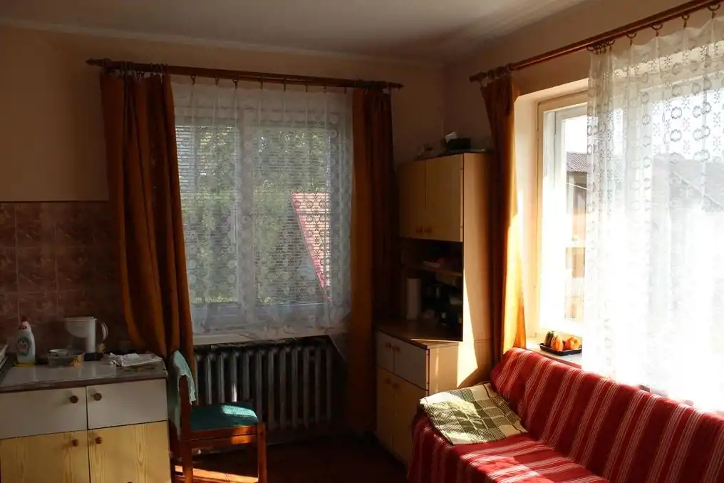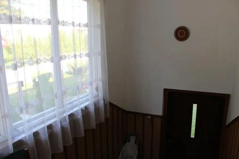 - Wejście na parter odbywa się przez przestronny ganek, na tej kondygnacji znajduje się: kuchnia, spiżarka, sypialnia, pokój, łazienka z WC, oraz klatka schodowa na I piętro, gdzie mamy podobny rozkład pomieszczeń jak na parterze: pokój (zamiast kuchni), spiżarka, sypialnia, pokój, łazienka z WC do urządzenia - wszystkie podłącza istnieją.