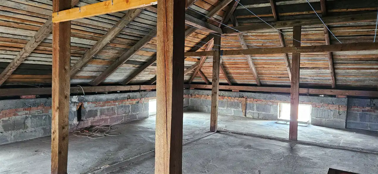 - Materiał budowy: cegła i pustak, strop oraz fundamenty betonowe, ściany dwudziałowe z pustką powietrzną gwarantującą dobrą izolację.