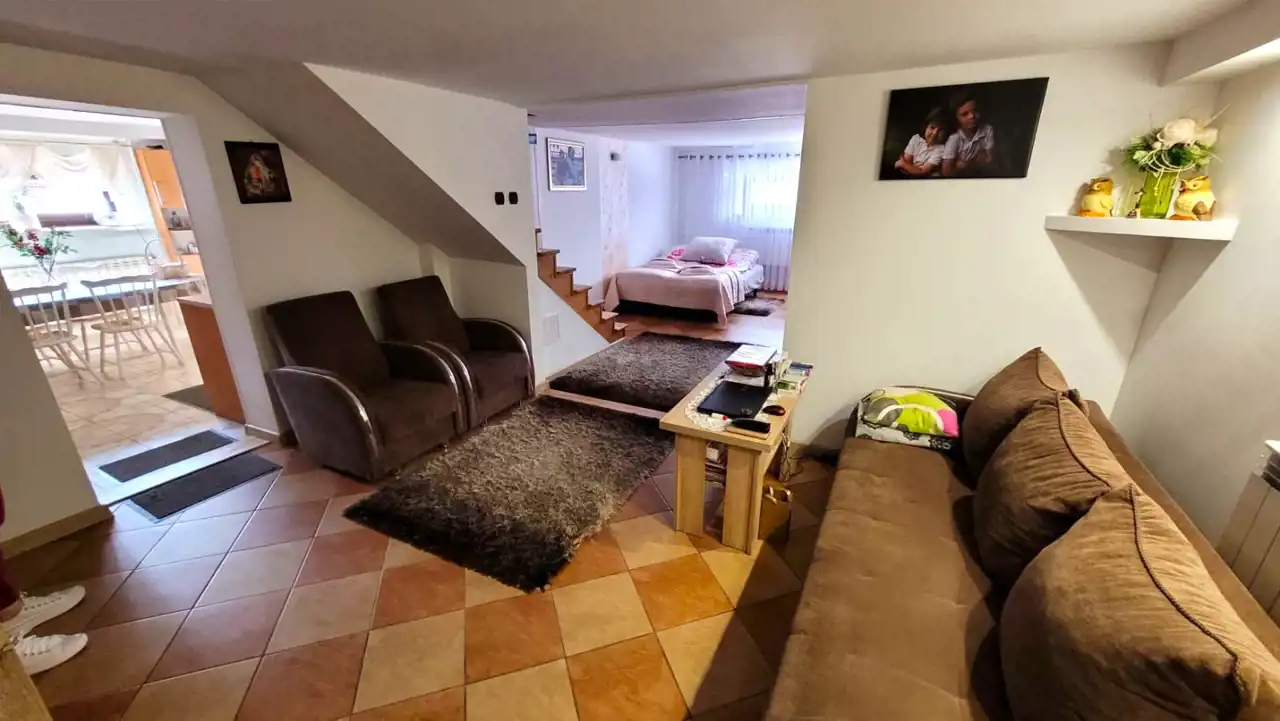 - Budynek podzielony jest jest na dwa osobne mieszkania z osobnymi wejściami. Każda z kondygnacji składa się z 2 pokoi, olbrzymiej kuchni, przedpokoju, łazienki oraz spiżarni.