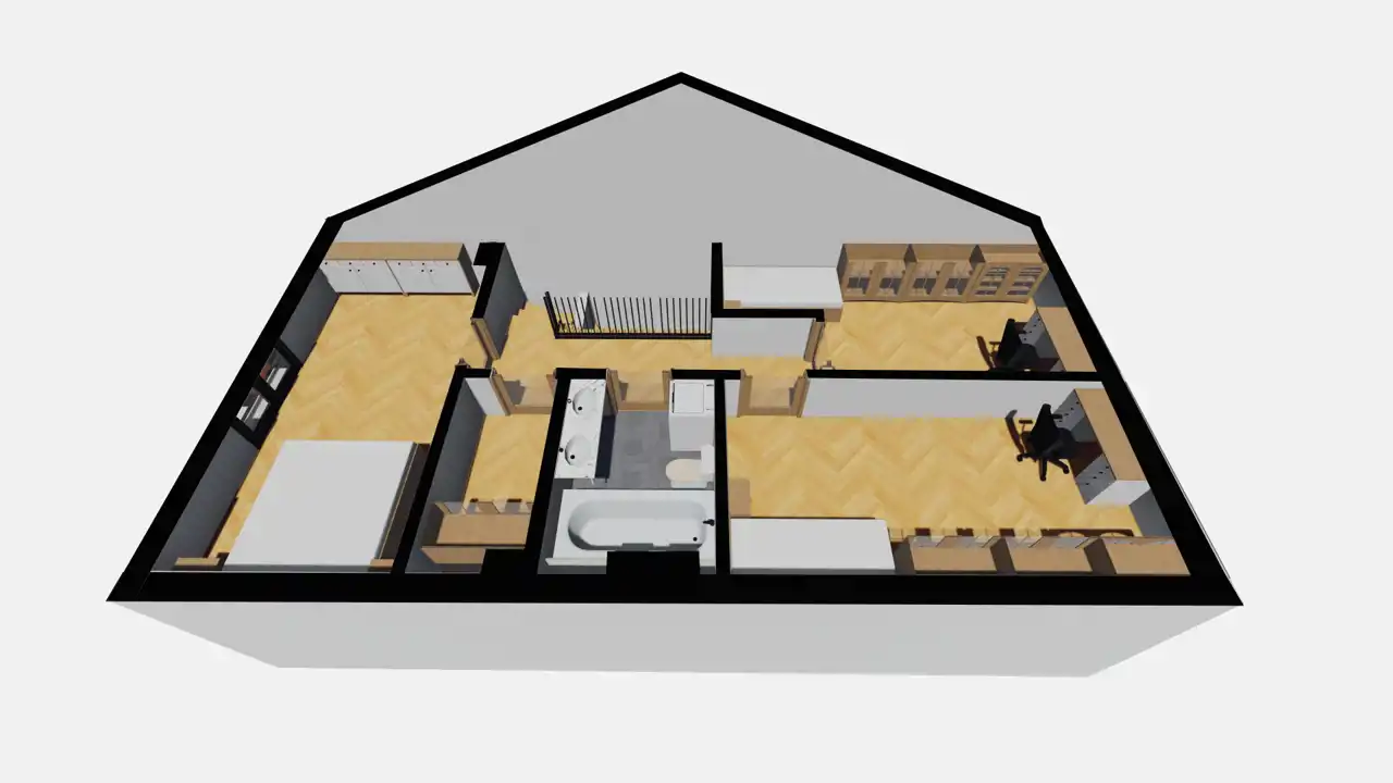 - Poddasze: trzy sypialnie 16,30m2,12,70m2, 14,60m2, łazienka z WC 5,20m2, pomieszczenie gospodarcze 3m2, korytarz10,60m2