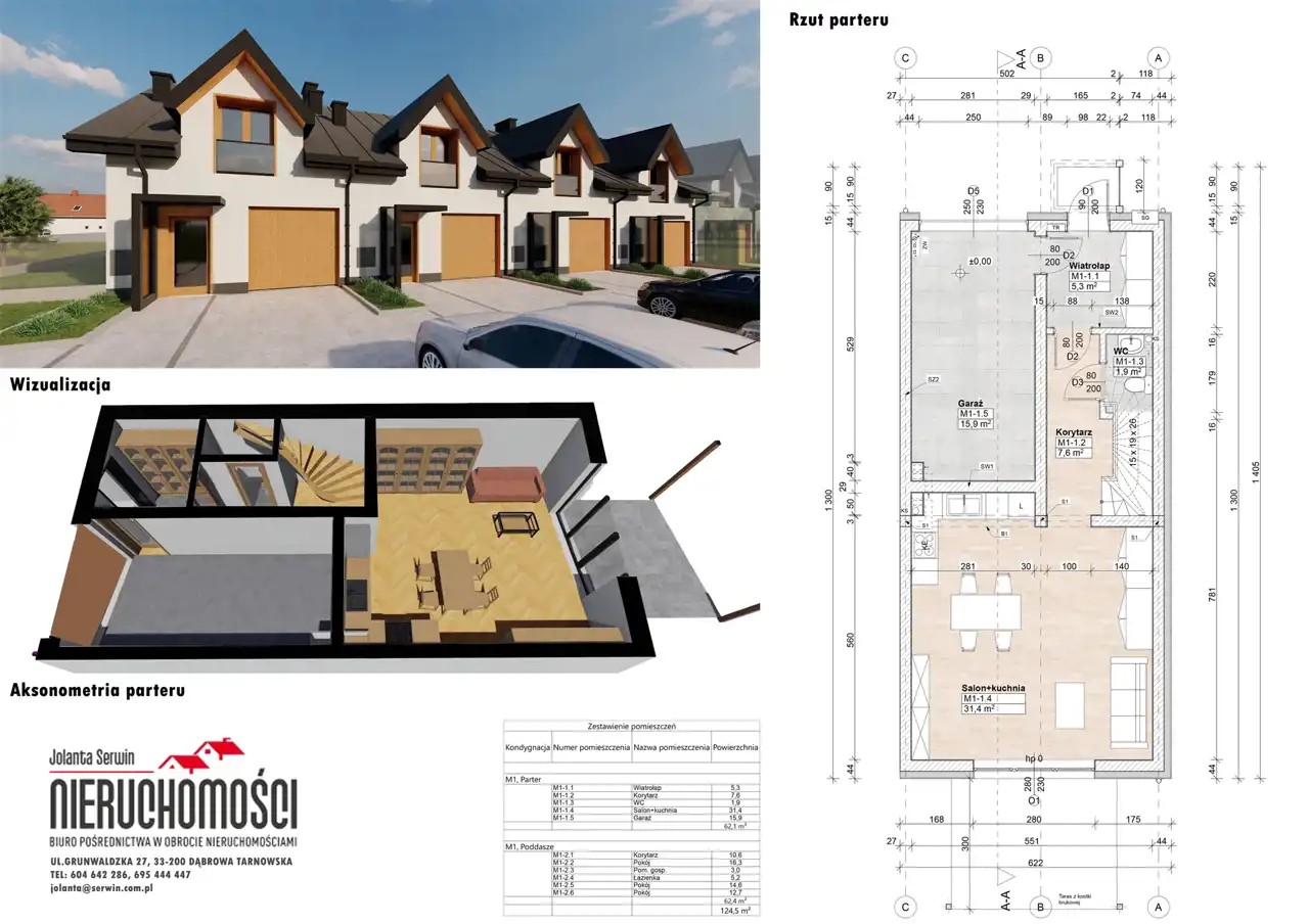 - Parter: salon+kuchnia 31,40m2, korytarz 7,60m2, WC,1,90m2, wiatrołap 5,30m2, garaż 15,90m2,