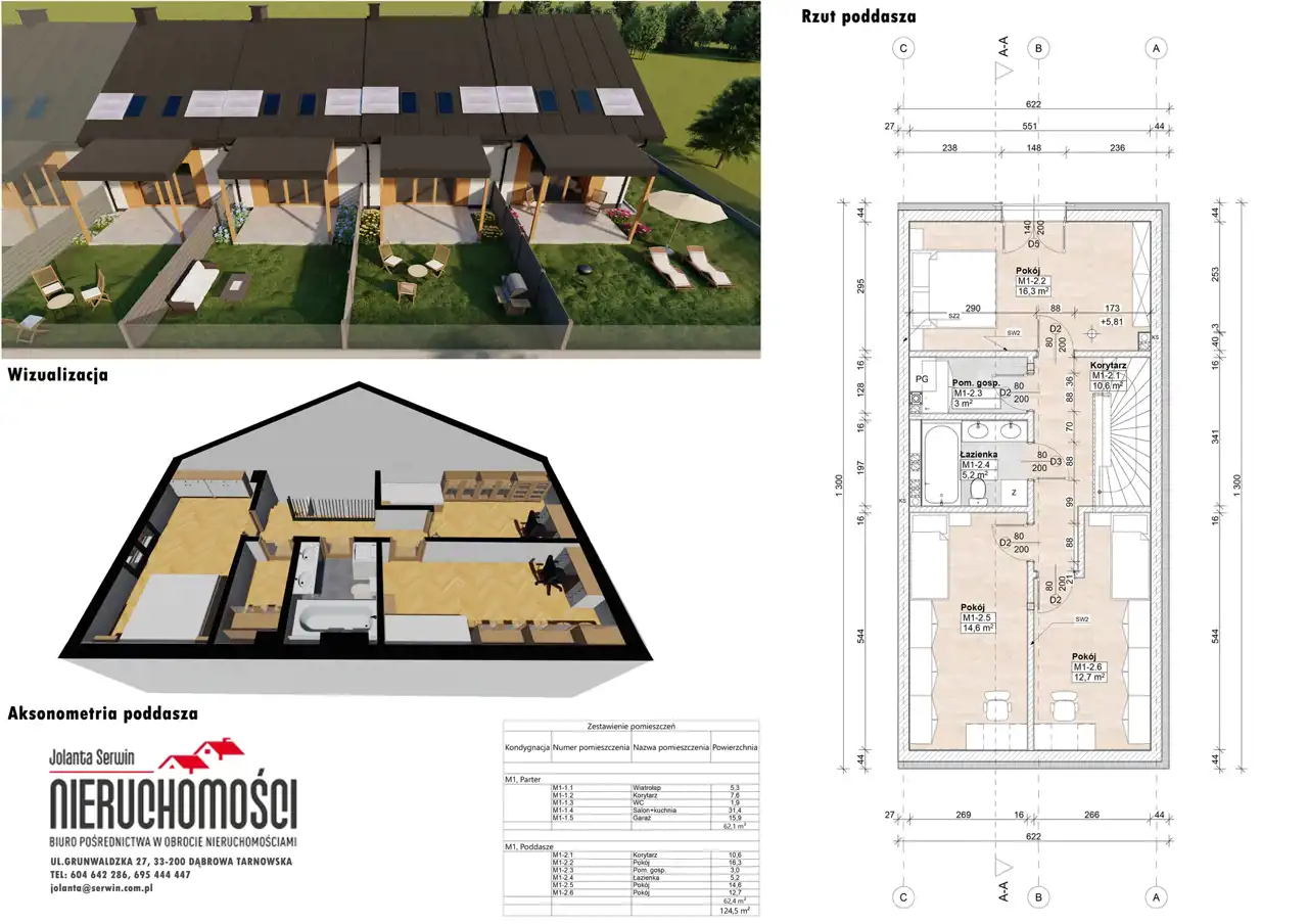 - Powierzchnia całkowita jednego segmentu wynosi 124,5 m2, wraz z garażem jednostanowiskowym.