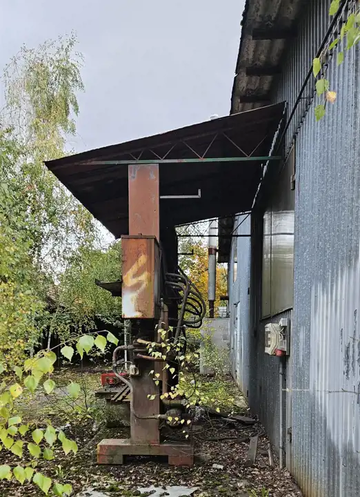 Obiekt o konstrukcji stalowej, z dachem pokrytym eternitem. Wysokość hali w najwyższym punkcie wynosi około 6 metrów, co zapewnia przestronność i komfort użytkowania. Wysokie bramy wjazdowe (ok. 4 m) umożliwiają swobodny wjazd pojazdów o większych gabarytach. Konstrukcję stanowią betonowe słupy oraz metalowe legary. Ogrzewanie realizowane jest za pomocą pieca opalanego węglem i drewnem. - Dodatkowo na działce znajduje się metalowa wiata, która może służyć jako zadaszenie dla samochodów, oraz drewniany budynek gospodarczy przeznaczony do przechowywania drewna i sprzętów ogrodowych.