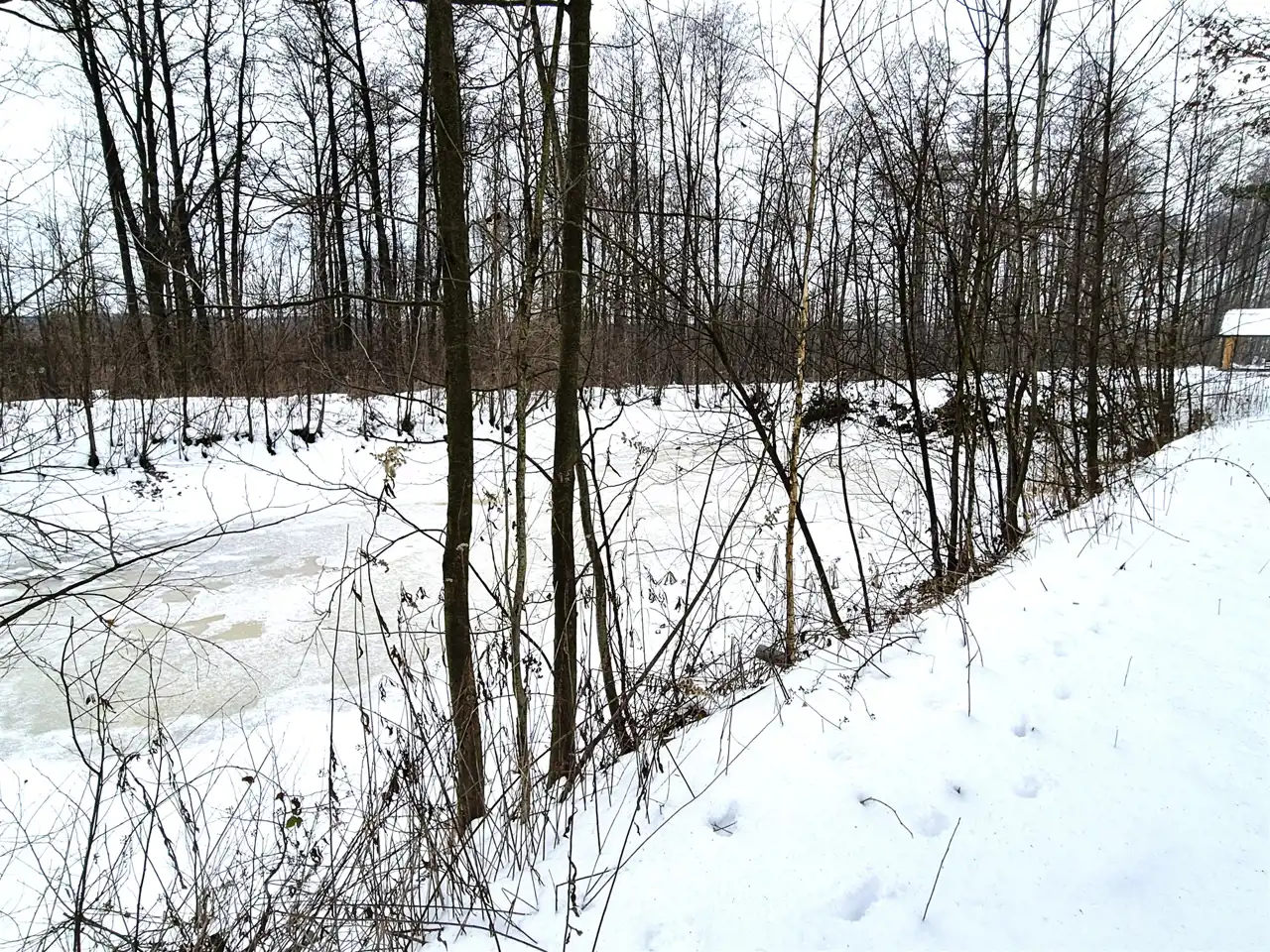 Na działce znajduje się mały lasek oraz staw