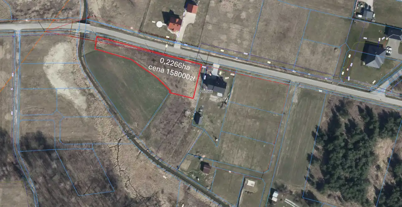 - Oferujemy do sprzedaży piękną działkę budowlaną o powierzchni 0,2266ha usytuowaną w pierwszej linii zabudowy.