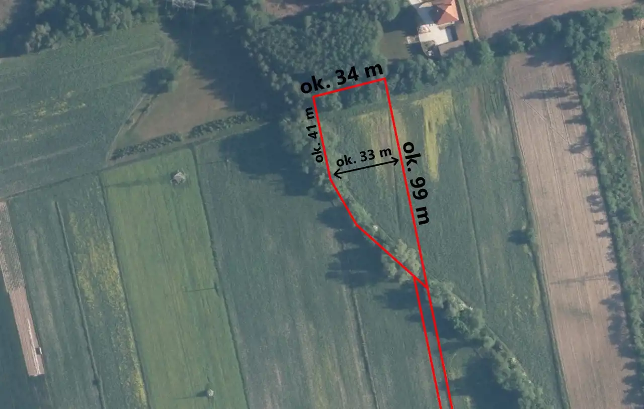- Wymiary działki: ok. 33m x 99m x 34m x 41m. Front działki: ok. 33 m.
