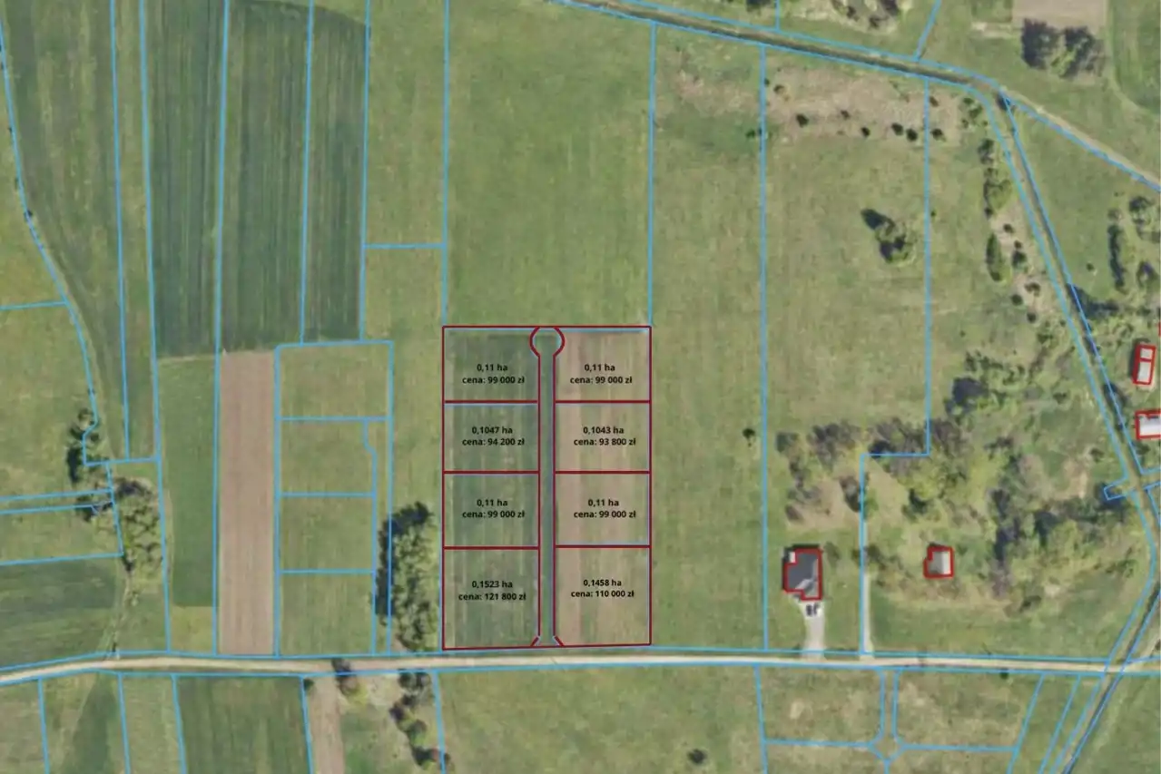 Powierzchnie działek od 0,1043ha do 0,1523ha – idealne zarówno pod budowę domu jednorodzinnego, jak i jako inwestycja.