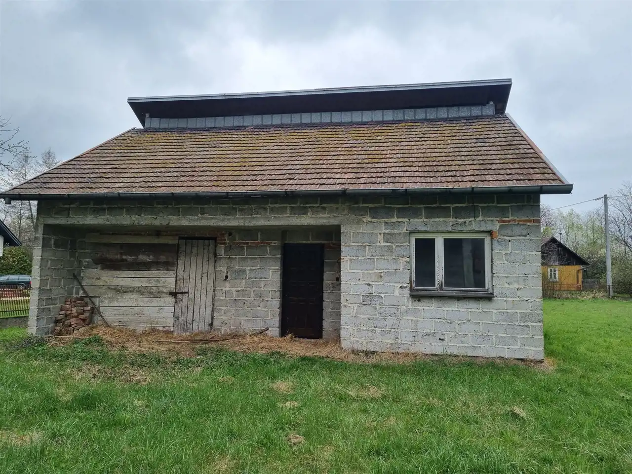 - Na działce znajduje się również budynek gospodarczy z pustaka, kryty dachówką ceramiczną w którym znajduje się garaż na dwa samochody oraz letnia kuchnia.