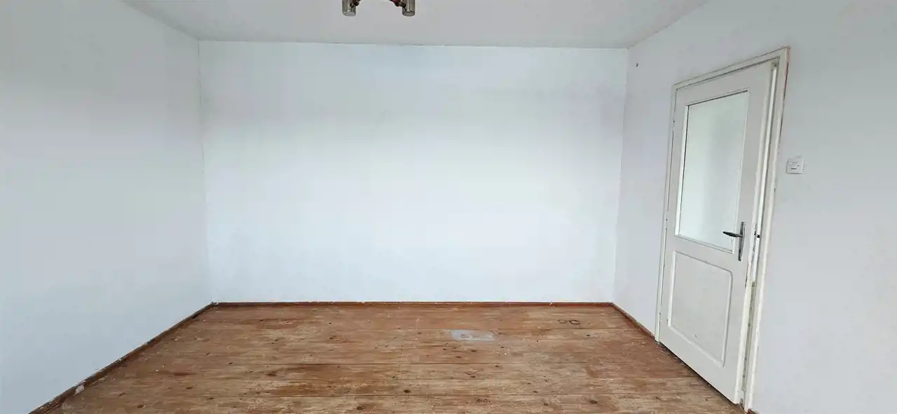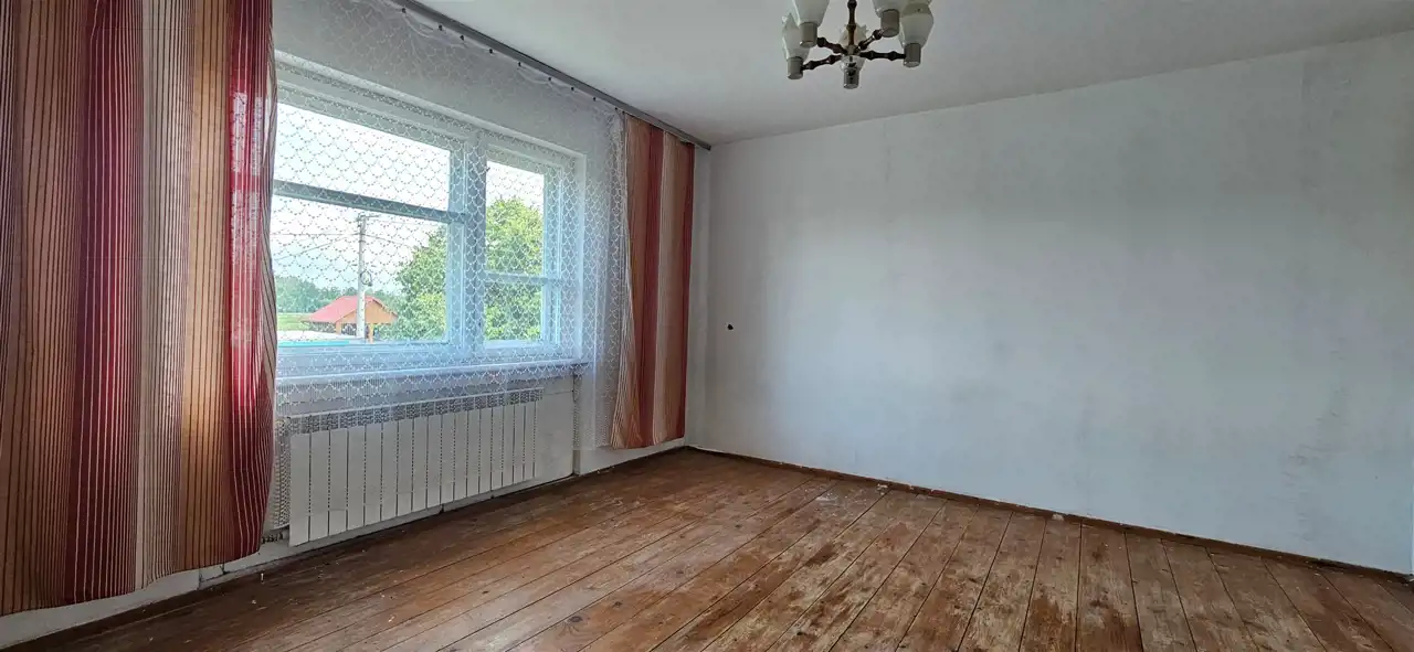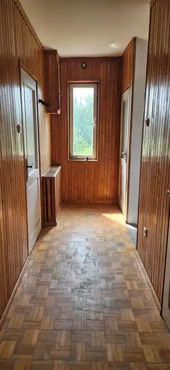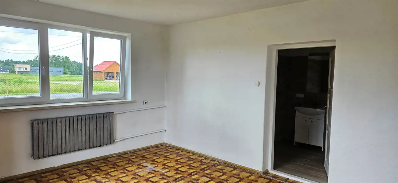- Podłogi – deski i parkiet w dwóch pokojach oraz przedpokoju, wylewka cementowa w pozostałych pomieszczeniach,
