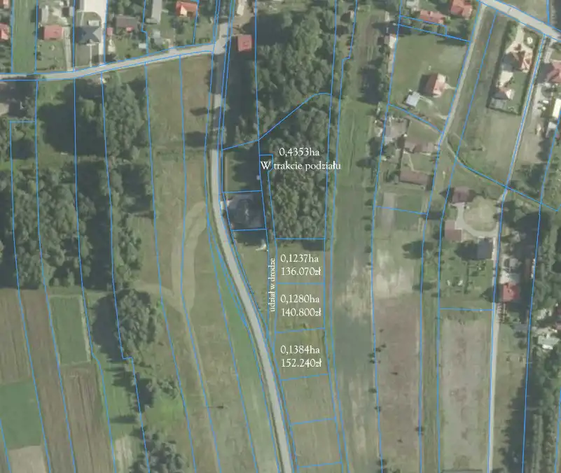 - 0,4353 ha – czwarta linia zabudowy, działka w trakcie podziału geodezyjnego na mniejsze działki ( dojazd z drogi wewnętrznej, udział wpisany do Księgi Wieczystej).