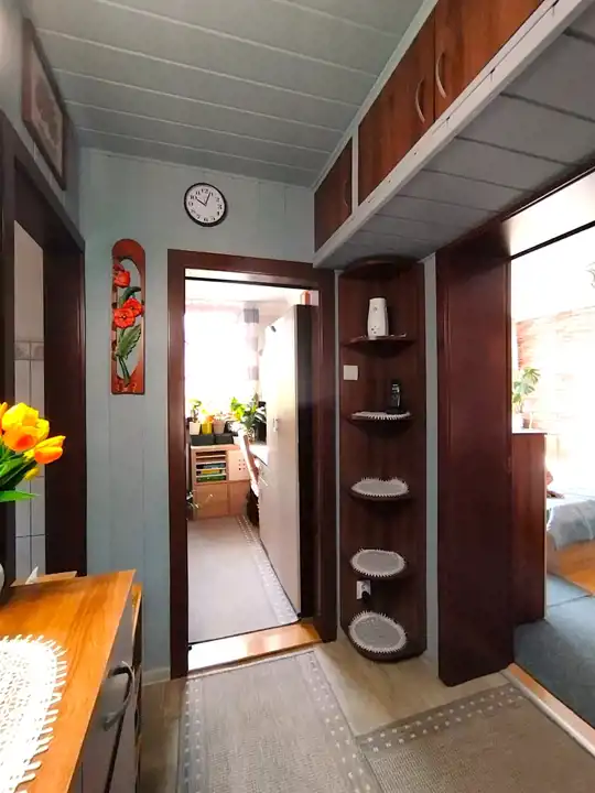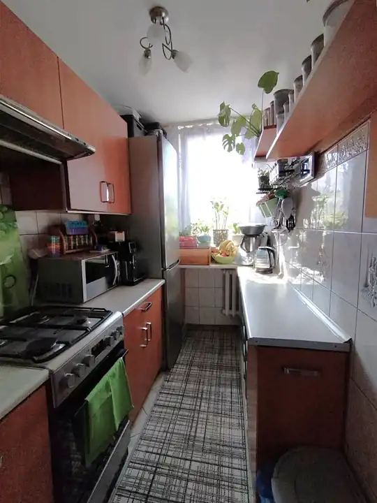 Mieszkanie częściowo umeblowane. W kuchni meble oraz sprzęt AGD (lodówka, kuchenka gazowa). W przedpokoju szafa w zabudowie. Okna PCV z roletami i moskitierami. Na podłogach panele i płytki. Częściowo wymieniona instalacja gazowa.