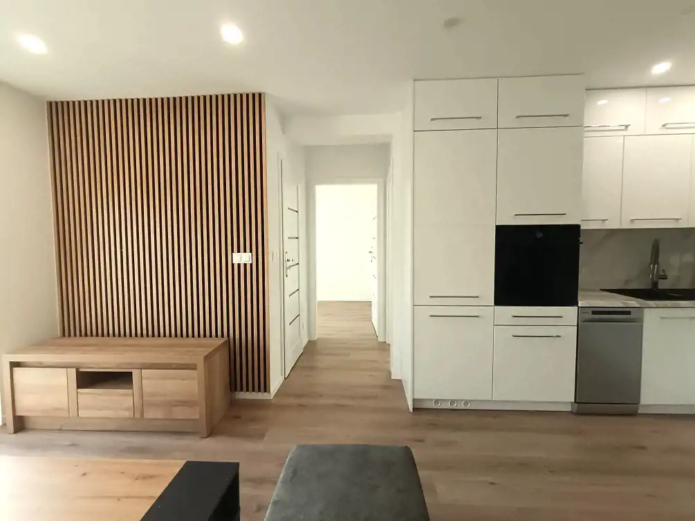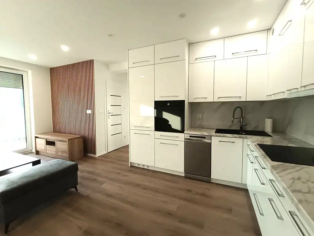 - W pokoju dziennym połączonym z aneksem kuchennym: zabudowa kuchenna wraz z sprzętem AGD: płyta indukcyjna, okap, piekarnik, lodówka, zmywarka, zestaw wypoczynkowy, ława, szafka telewizyjna. Balkon od strony południowej.