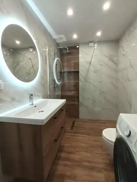 - W łazience z WC: prysznic, umywalka, szafka, pralka.