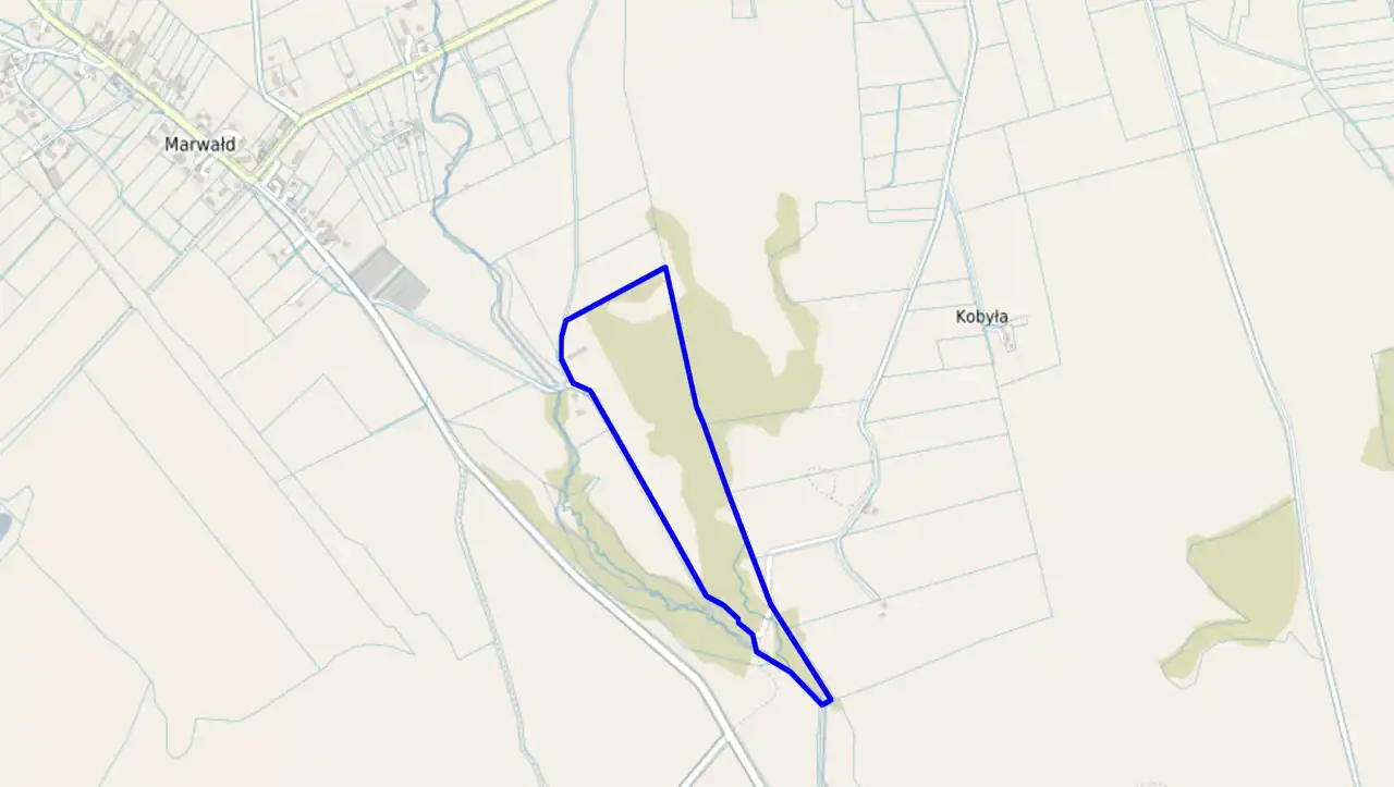 Nieruchomość składa się z dwóch działek (222 i 223), położonych zaledwie 600 metrów od zwartej zabudowy wsi Marwałd. To idealny dystans – jesteś wystarczająco blisko cywilizacji, by czuć się bezpiecznie, i wystarczająco daleko, by cieszyć się ciszą, którą przerywa jedynie szum płynącego wzdłuż granicy strumienia.
