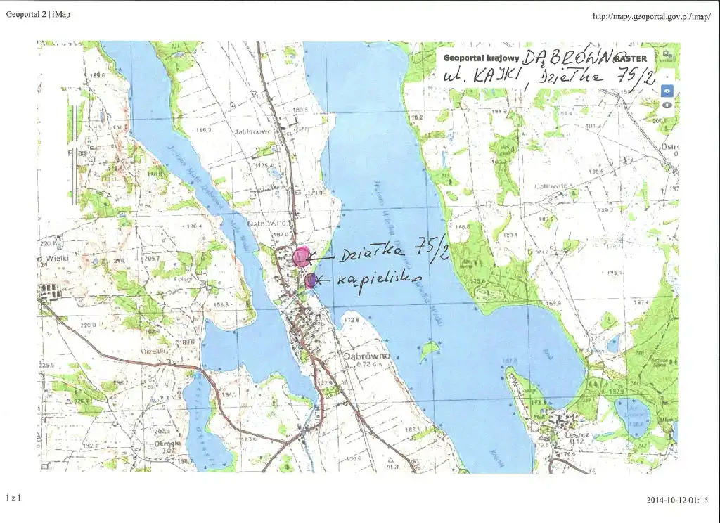 Dwie działki budowlane, nr ewidencyjny 75/4, każda o powierzchni 1290 m2, na sprzedaż w Dąbrównie, w Powiecie Ostródzkim. Jedna z najlepszych dostępnych lokalizacji-działki przy ul. Kajki w Dąbrównie, położone na wzniesieniu działek opadających tarasowo od strony południowej w kierunku jeziora Wielka Dąbrowa. Różnica poziomów, działka - jezioro ok 12 m. Różnica poziomów pomiędzy tarasami ok. 5 m. Panoramiczny, daleki widok. Kształt działek zbliżony do prostokąta o bokach 30 x 40 m. Uzbrojenie : prąd, woda, kanalizacja w pobliżu. Dojazd – ulica Kajki droga gminna o nawierzchni asfaltowej, w końcówce droga gruntowa. Odległości: około 200 m kąpielisko gminne , około 700 m centrum wsi, sklepy. Dojście do trudno dostępnej linii brzegowej Jeziora Wielka Dąbrowa, gruntową publiczną drogą gminną. Dąbrówno, wieś gminna pomiędzy jeziorami Małą i Wielką Dąbrową, 8 km od Grunwaldu, 15 km od Góry Dylewskiej, 180 km od Warszawy. Kontakt i informacje: Jerzy Stanisławski tel. 603 072 580.