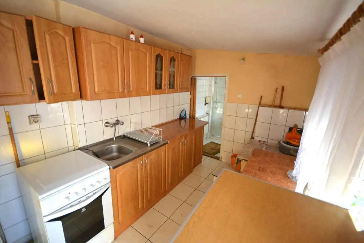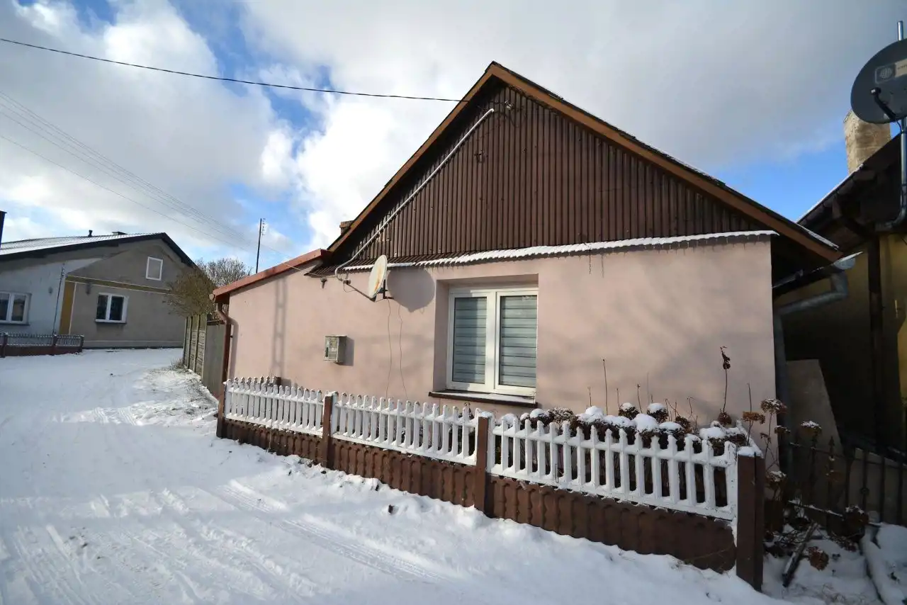 For Sale: A house with a total area of approximately 70m² (usable area of approximately 51m²) located in Wójtostwo, Daleszyce Municipality. The house comprises two rooms with areas of approximately 20.83m² and 22.09m², a kitchen with an area of approximately 9.35m², a bathroom with WC (approximately 4.24m²), a vestibule, and a boiler room with a utility space. The building is made of wood, insulated with styrofoam, and has a sheet metal roof. Heating is provided by an eco-pea coal furnace.