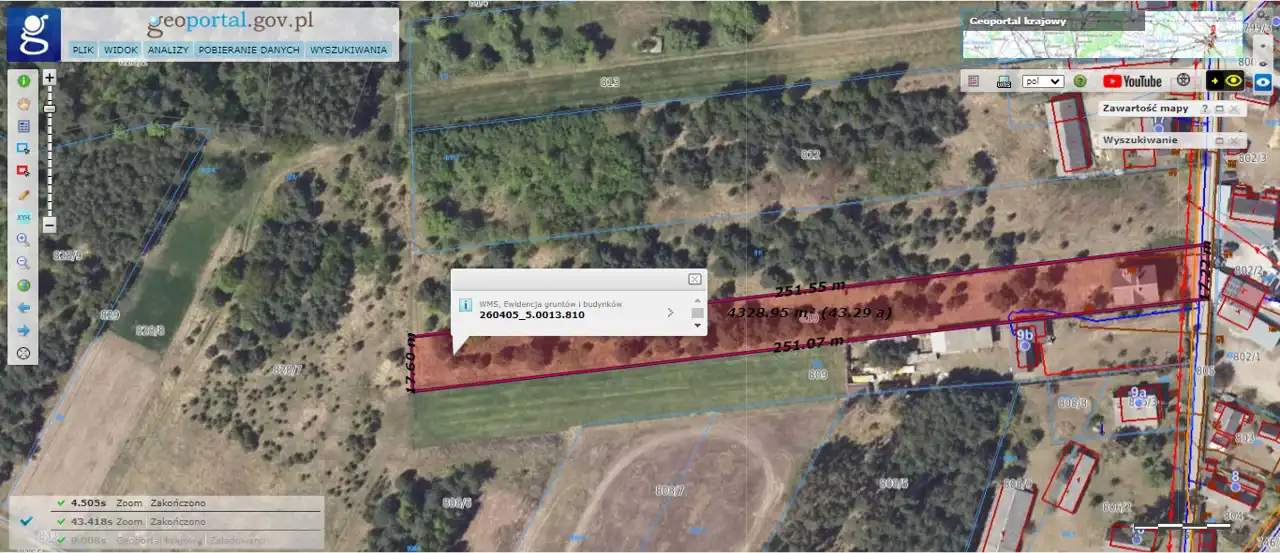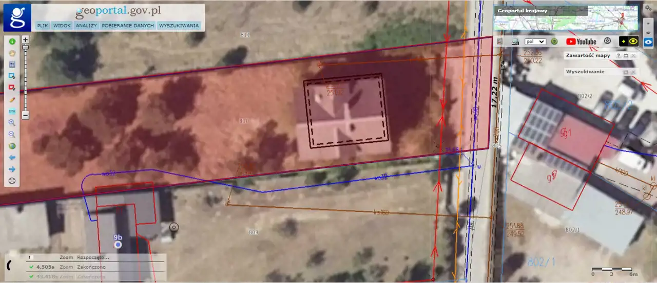 Wymiary działki (w przybliżeniu): 17,2 (szer. od frontu) x 251 x 17,6 x 251 [m].