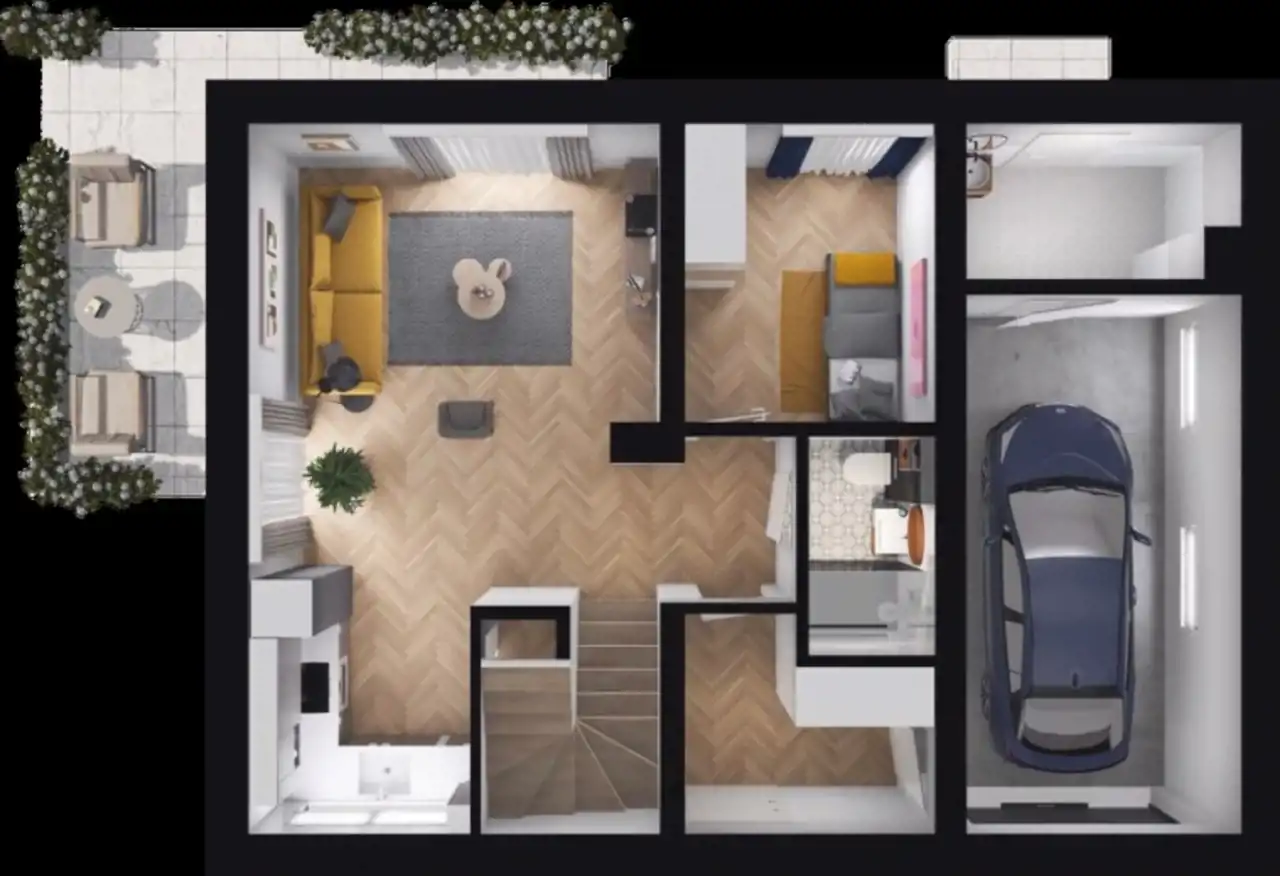 Parter: wiatrołap, hall, łazienka z prysznicem, salon z kuchnią i wyjściem na taras, spiżarnia, kotłownia z pompą ciepła, garaż.