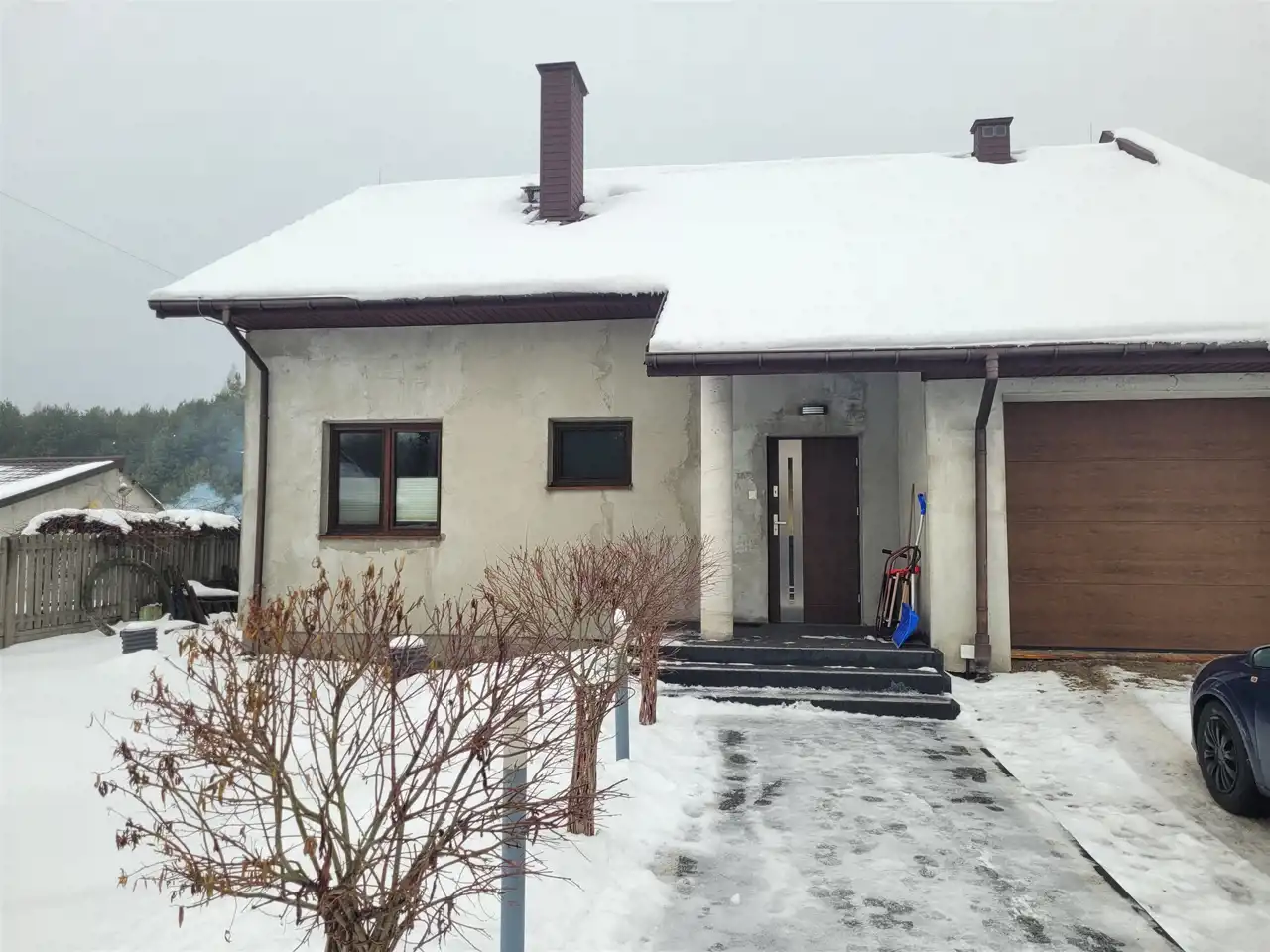 Furtka na elektrozaczep, brama automatyczne zarówno na wjazdowa na posesję jaki i do garażu w bryle budynku. Ogrzewanie podłogowe w części domu. Na zewnątrz elewacja wymaga wykończenia, ocieplona styropianem grafitowym o grubości 15 cm.