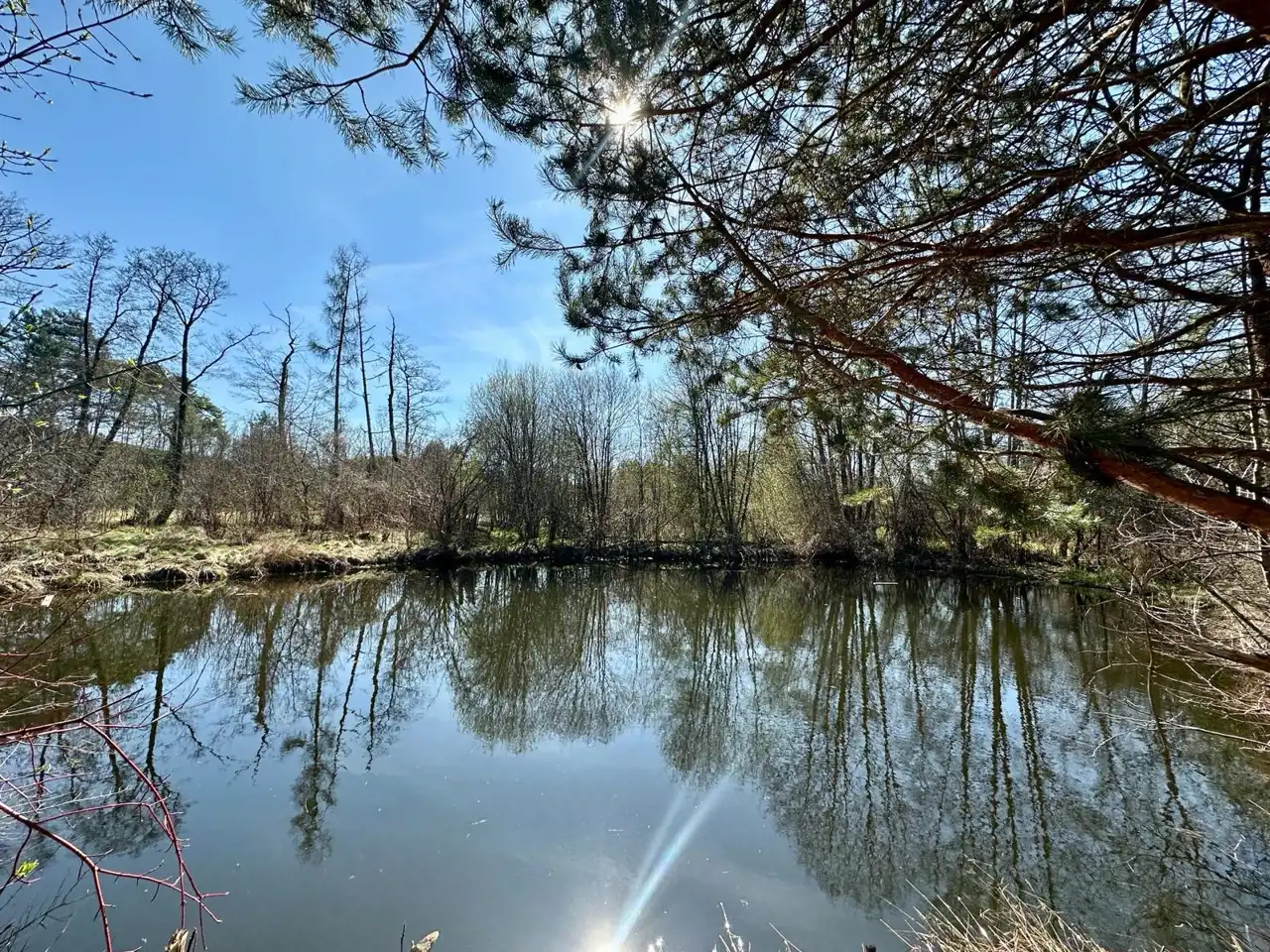 Wokół domy jednorodzinne, las, staw w bliskiej odległości rzeka Nida.