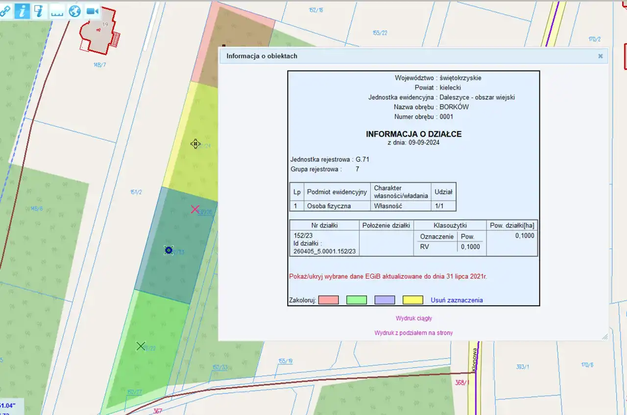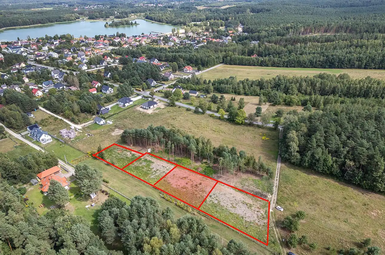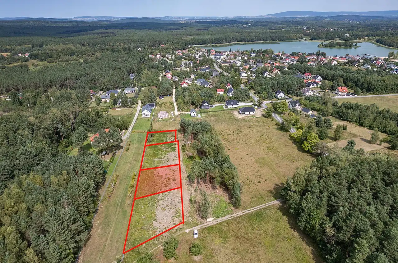 For sale: a 1000 m² plot located in Borków, Daleszyce municipality. The plot is situated on the edge of a forest, within an area covered by the Local Spatial Development Plan, designated as MN – single-family residential development. The plot is flat and rectangular. The neighborhood includes single-family houses, a forest, and a reservoir. Convenient access – 20 minutes from the center of Kielce (16 km).