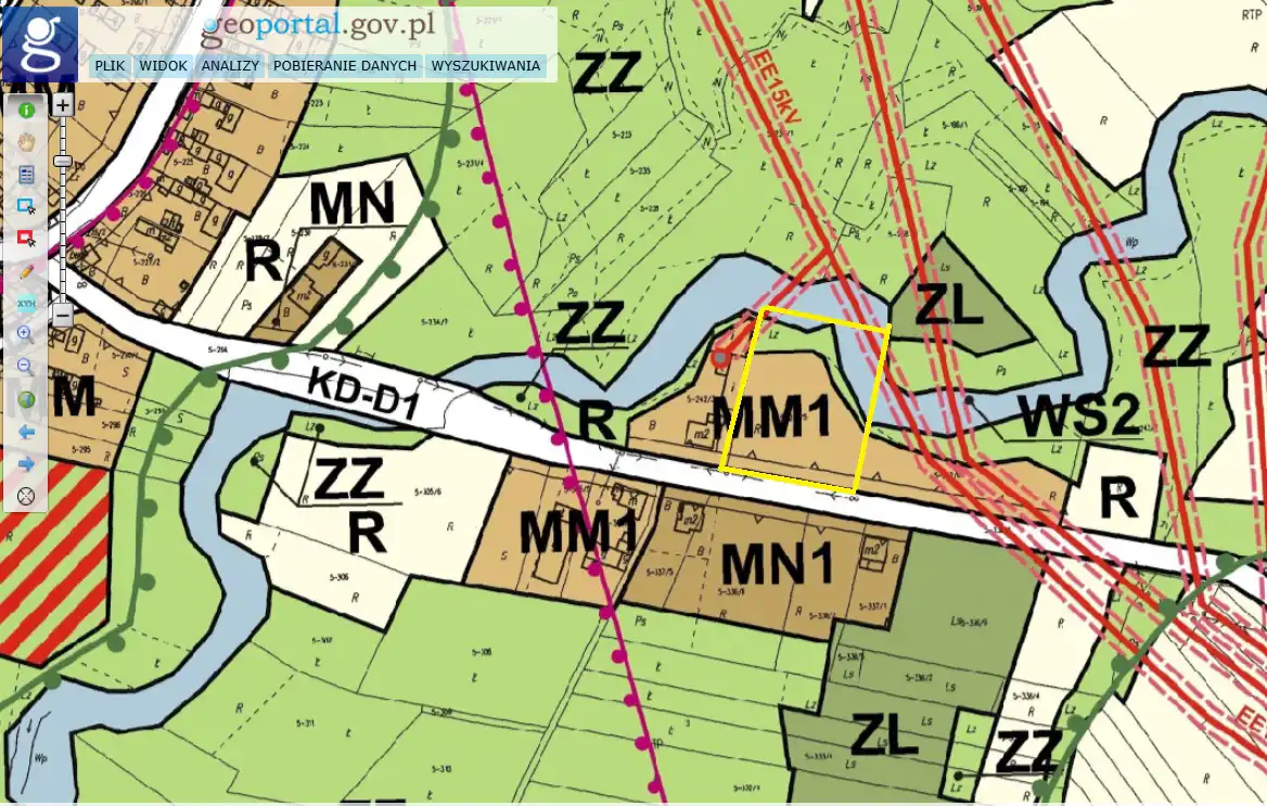 Grunt znajduje się w terenie objętym Miejscowym Planem Zagospodarowania Przestrzennego na obszarze ok. 2700m2 jako teren MM1 tereny zabudowy mieszkaniowej (przeznaczenie podstawowe: zabudowa zagrodowa i mieszkaniowa jednorodzinna), pozostała powierzchnia oznaczona symbolem Lz - tereny zalesień.