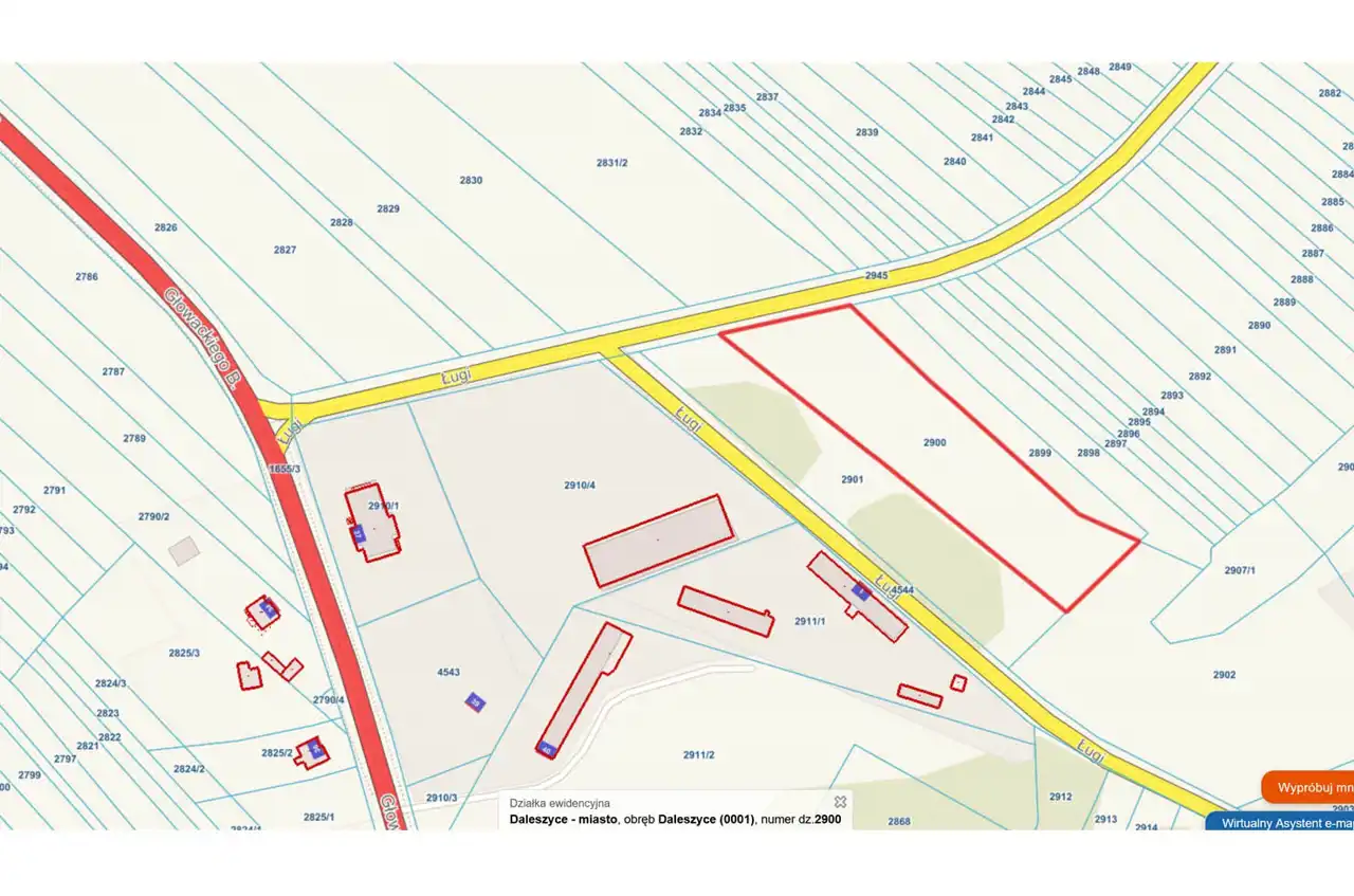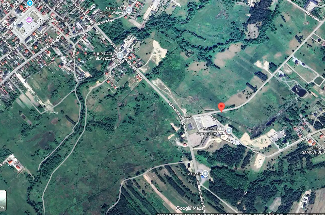 For sale: a plot of land with an area of 6,833 m², located in Daleszyce. The plot has an irregular shape, close to a rectangle, and is situated along an asphalt road. The surrounding area includes industrial facilities and single-family housing.