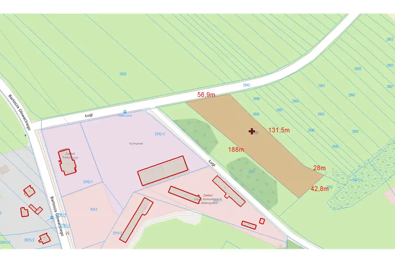 Wymiary działki: 56,9 x 131,5 x 28 x 42,8 x 188 [m]