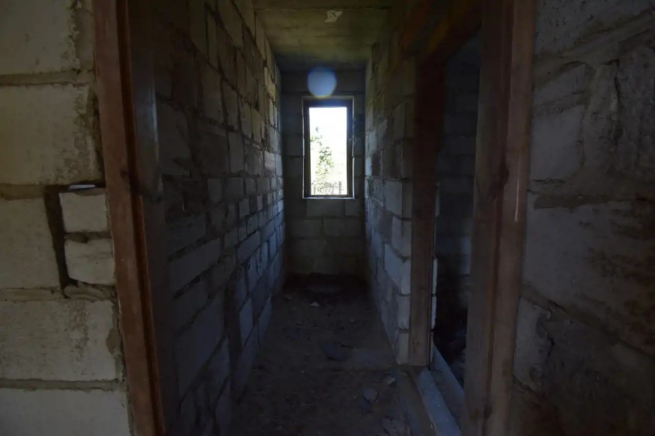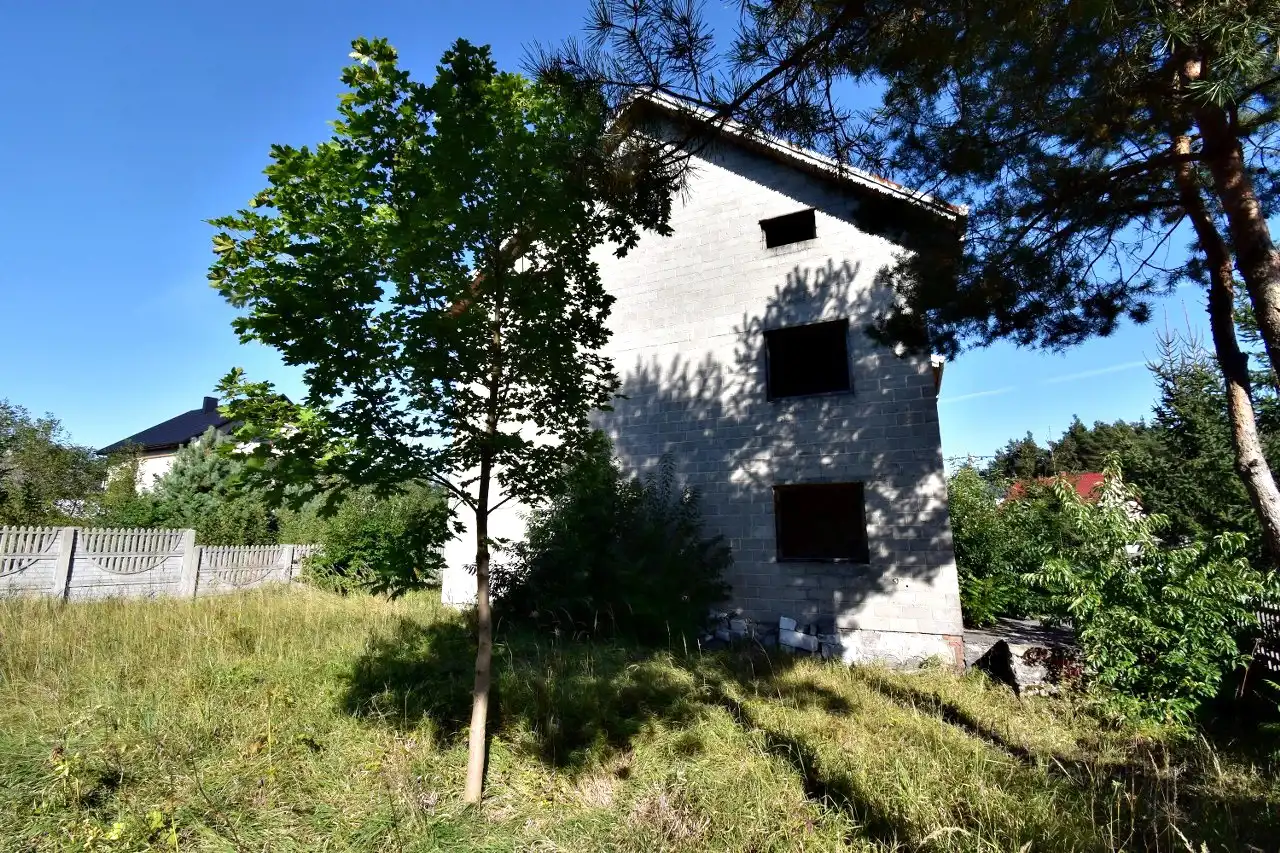 On the property, there is a brick, two-story house with an attic, in an open shell condition (construction began in the 2000s), with a total area of approximately 275 m².