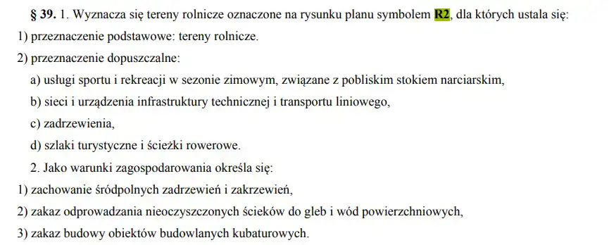 - o pow. 15 762 m2, w kształcie prostokąta, o wymiarach, ok. 28 m x 562 m., objęta Miejscowym Planem Zagospodarowania Przestrzennego R2 - przeznaczenie podstawowe: tereny rolnicze, przeznaczenie dopuszczalne: usługi sportu i rekreacji w sezonie zimowym, związane z pobliskim stokiem narciarskim, sieci i urządzenia infrastruktury technicznej i transportu liniowego, zadrzewienia, szlaki turystyczne i ścieżki rowerowe. Działka jest uzbrojona w prąd, oświetlenie, monitoring
