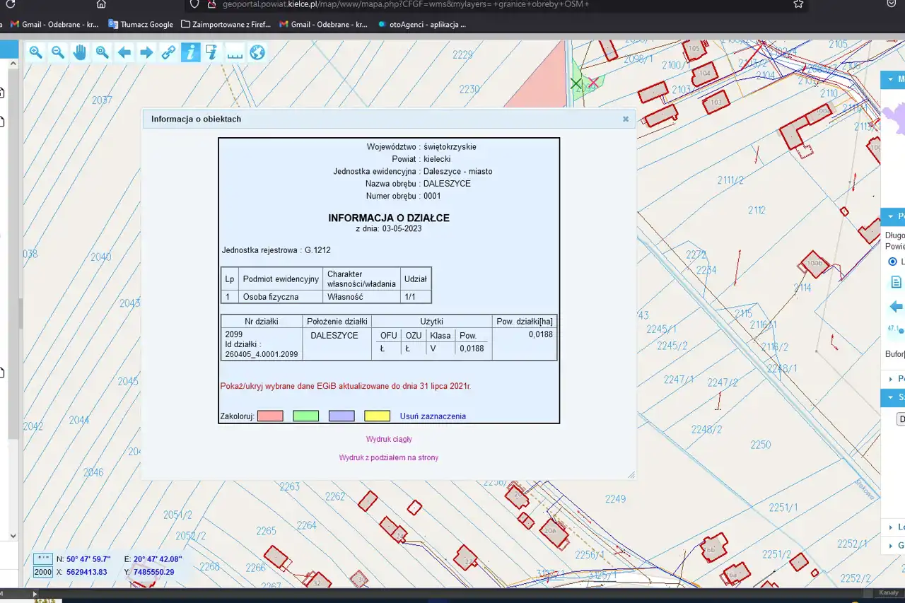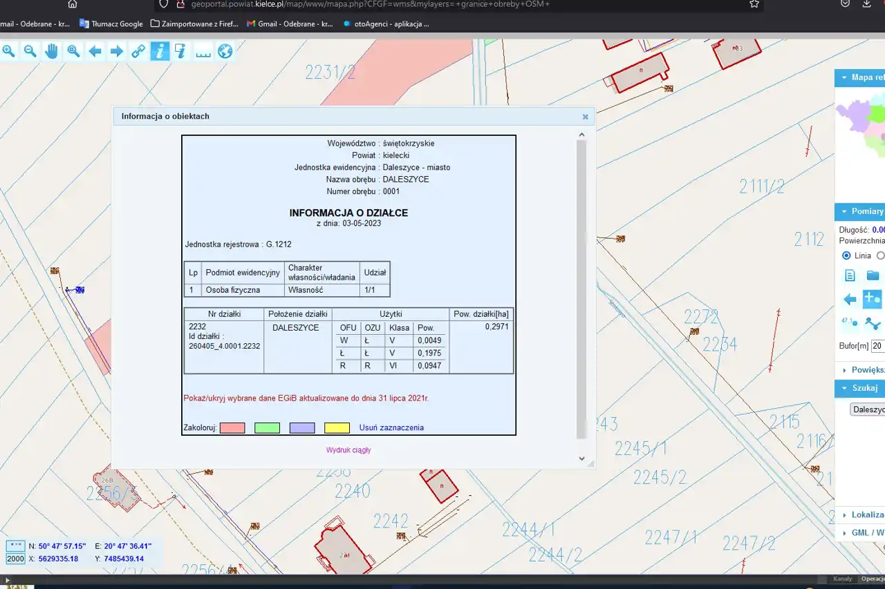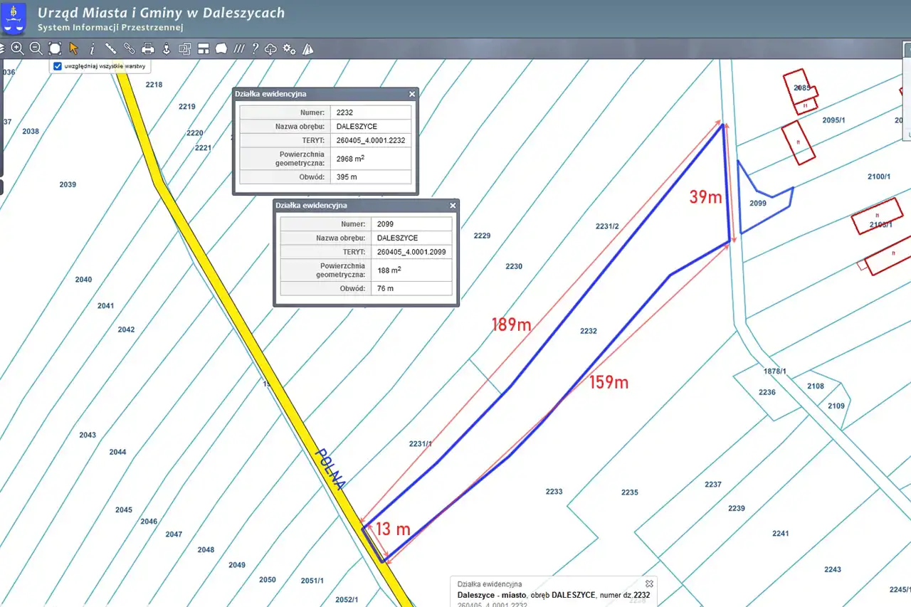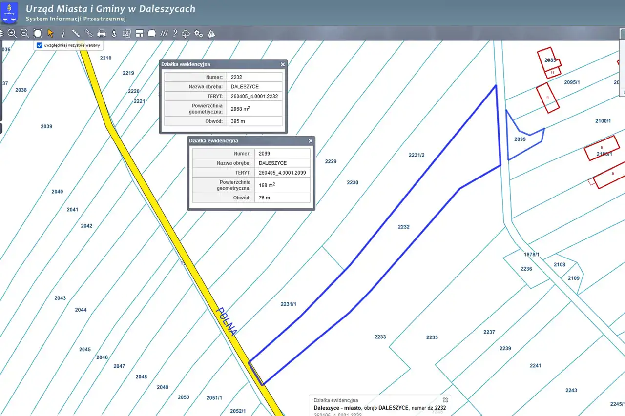 For sale: a plot of land with an area of 3100 square meters, located in the town of Daleszyce. The location is in a quiet, green corner, in a newly developing neighborhood of single-family homes. The plot is located 20 km from Kielce, with a 25-minute drive on an asphalt road, the last 150 meters on a dirt road.