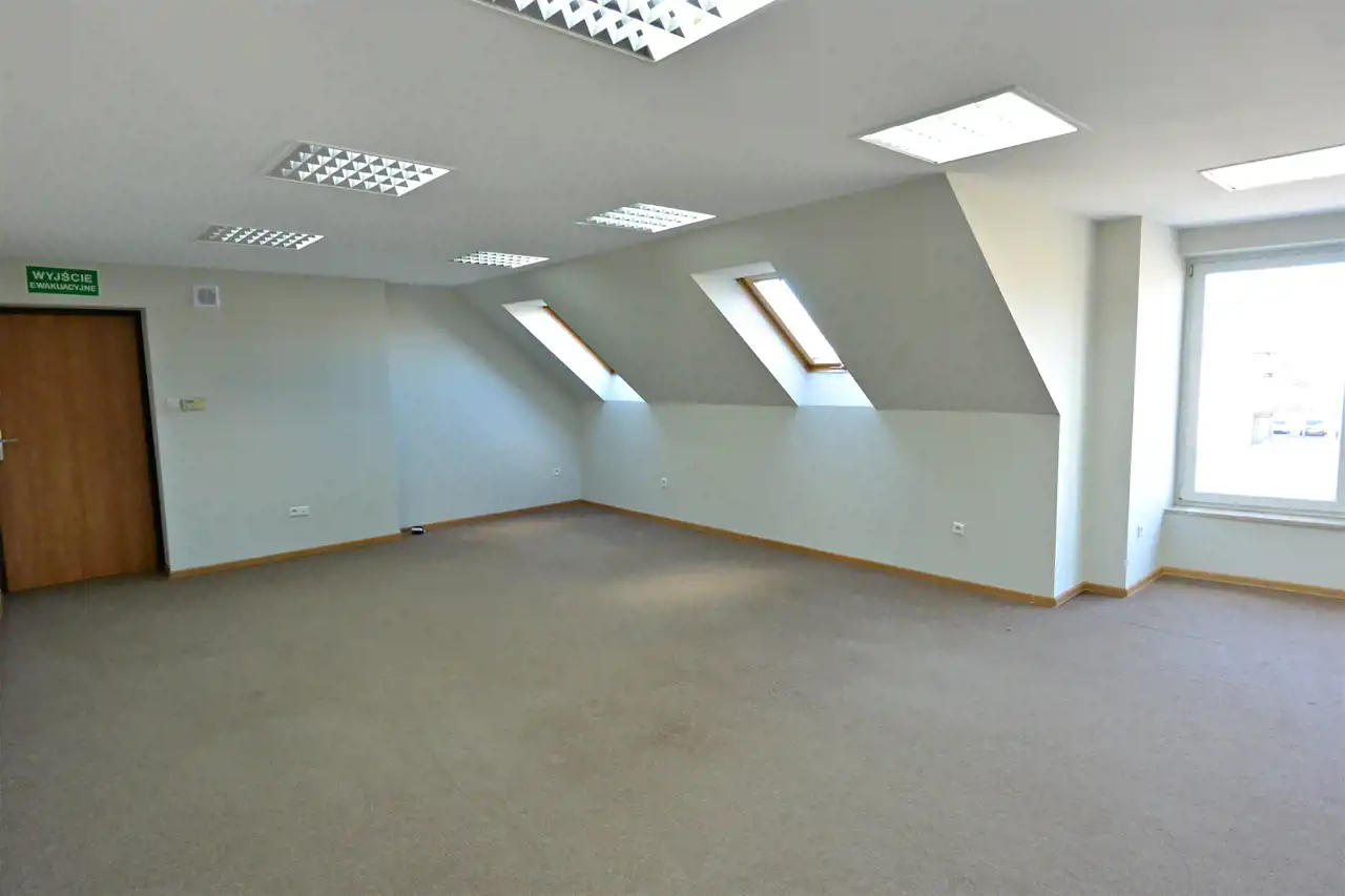 For rent: a premises with an area of approx. 50.89 m², located in the attic of a commercial and service building in the center of Daleszyce. Entrance to the unit through a shared staircase. The building has two entrances: from the front and from the yard.