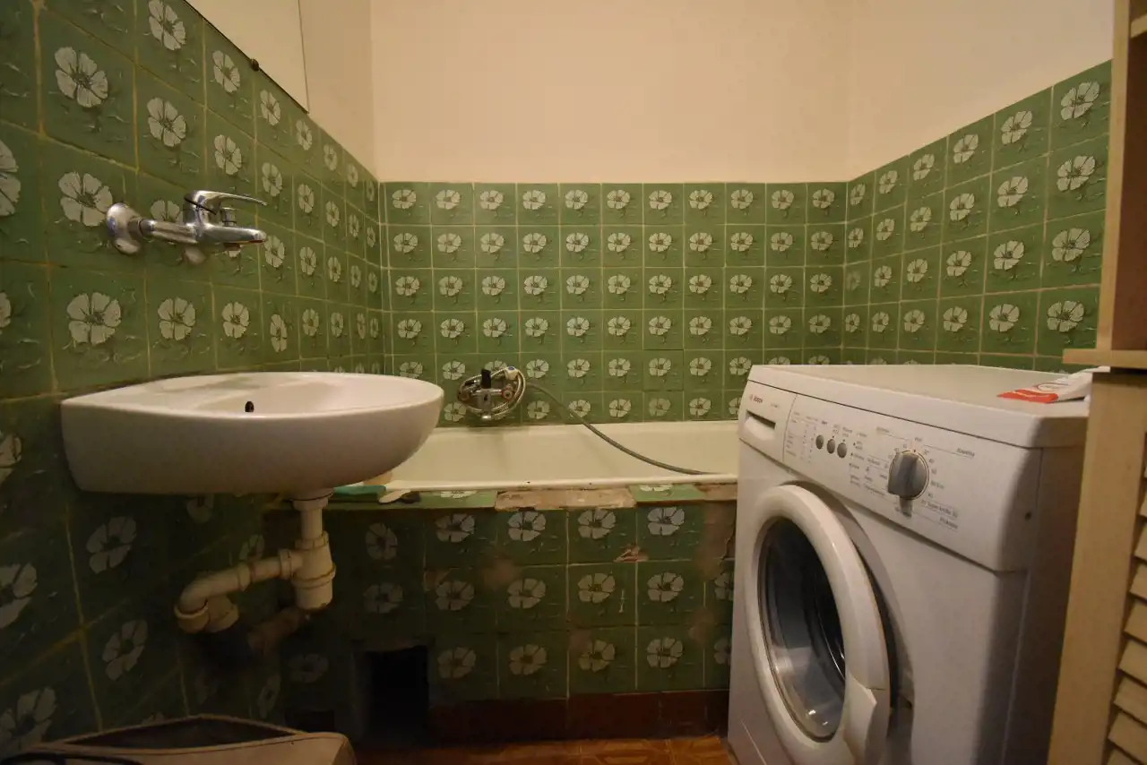 The apartment requires full renovation. Flooring includes panels and vinyl tiles. PVC and wooden windows, copper electrical wiring.