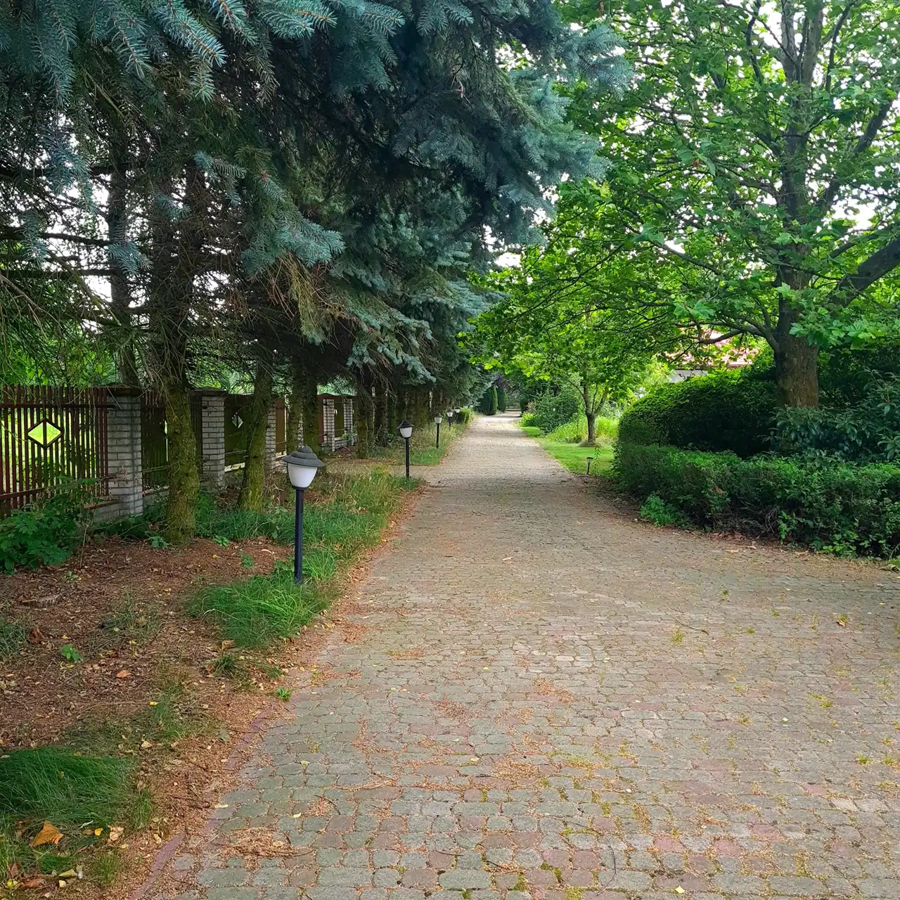 Droga dojazdowa do garaży - wyłożona kostką brukową .