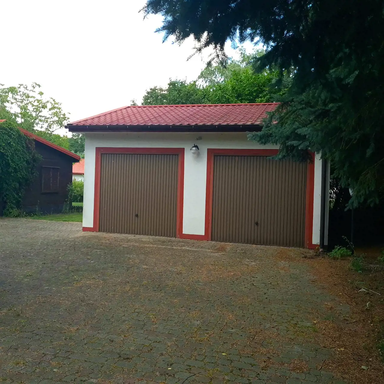Dwa oddzielne garaże murowane z wrotami uchylnymi .