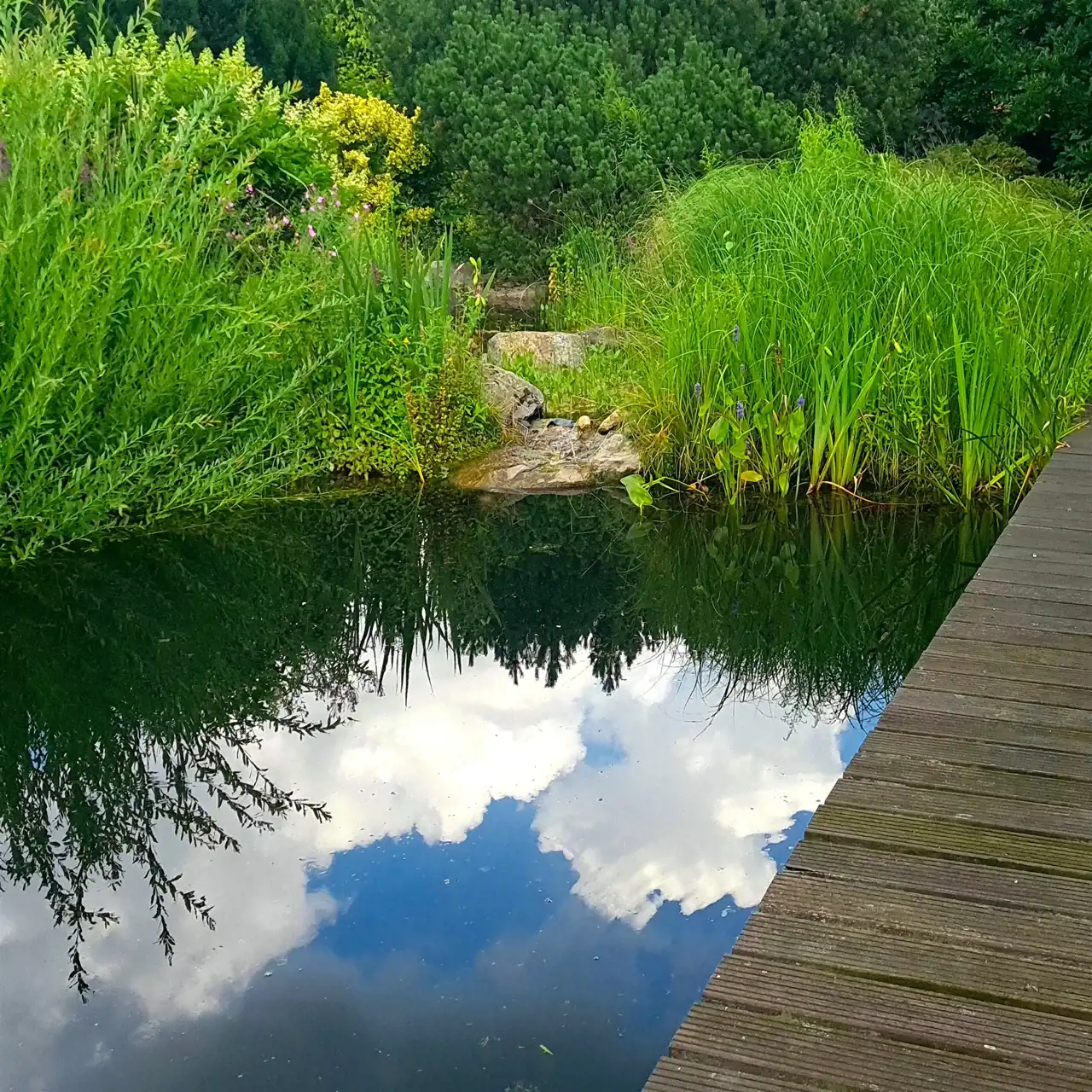 Staw - o powierzchni około 200 m2 z pomostem , roślinnością brzegową i kwieciem powierzchniowym .