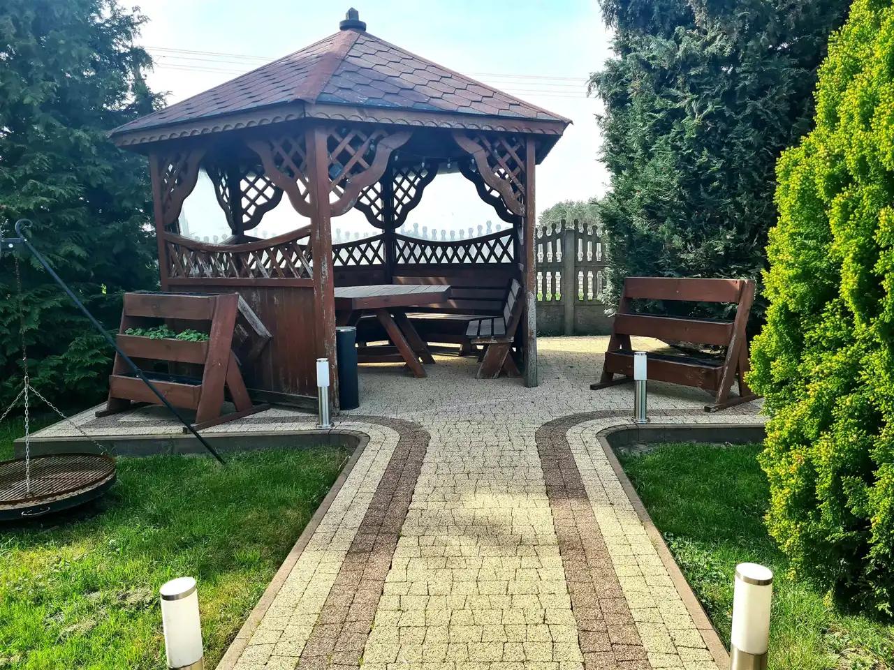 Dookoła domu zaaranżowano część wypoczynkowo-rekreacyjną z grillem i drewnianą altaną .