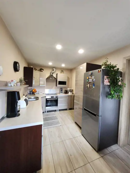 Nowoczesnej kuchni wyposażonej w sprzęt AGD oraz spiżarni, zapewniającej dodatkowe miejsce na przechowywanie.