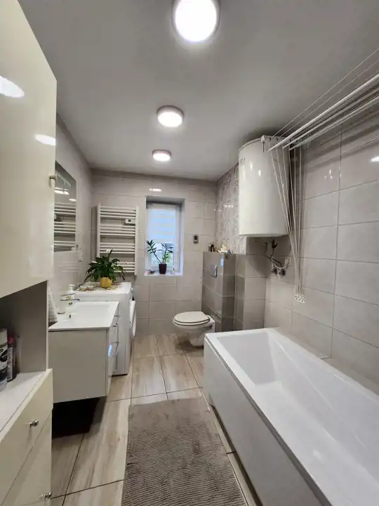 Łazienki wyposażone w wannę, umywalkę, WC oraz pralkę