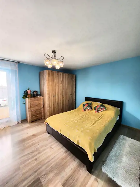 Komfortowej sypialni z bezpośrednim wyjściem na duży taras, idealny do relaksu na świeżym powietrzu.