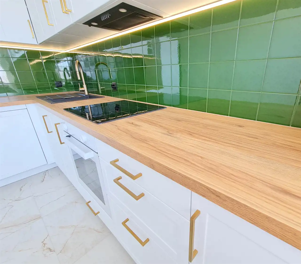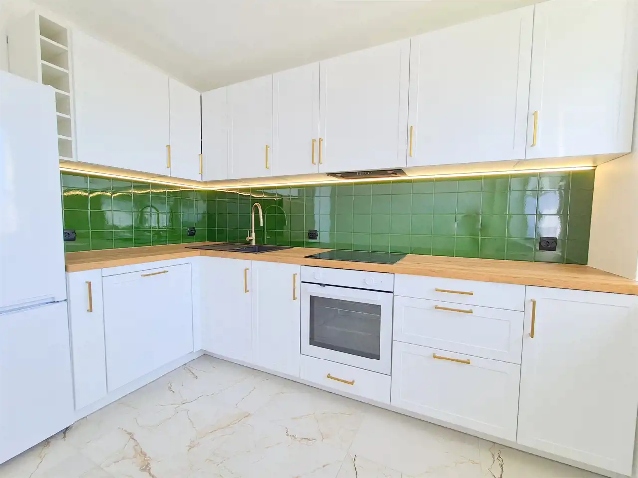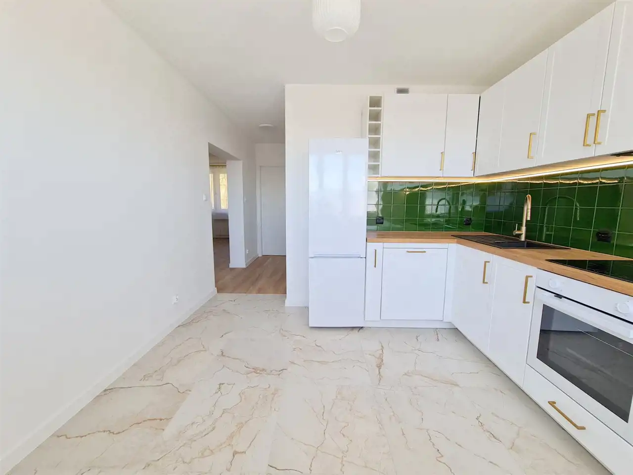 Wyposażenie kuchni: meble wykonane na wymiar, zmywarka o szerokości 60 cm, płyta indukcyjna, piekarnik, lodówko-zamrażarka, okap.