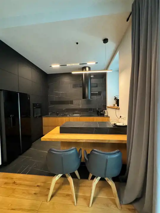 Aneks kuchenny: - płyta indukcyjna, piekarnik, lodówka, zlew, kuchenka w zabudowie, wyspa, krzesło.
