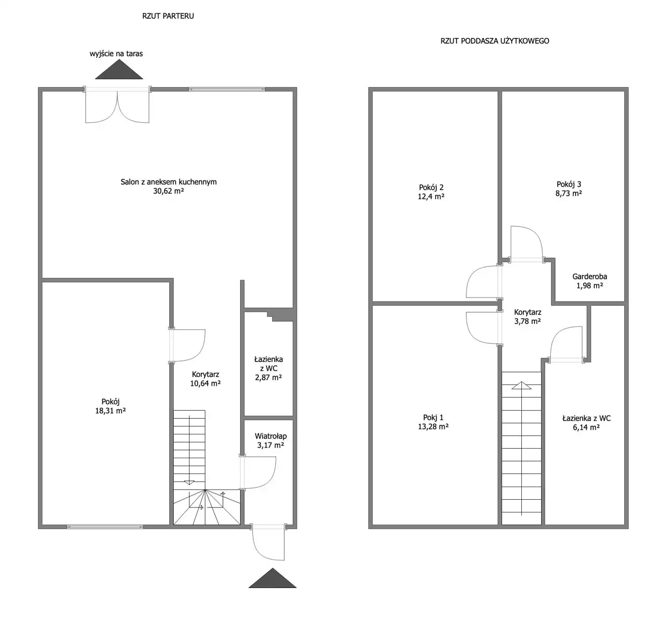 - Garderoba (1,98 m²) – idealny jako sypialnia główna.