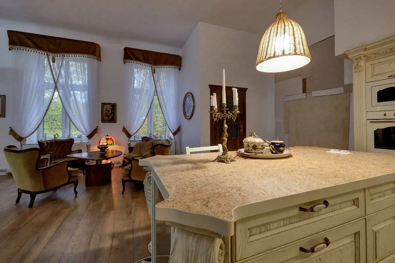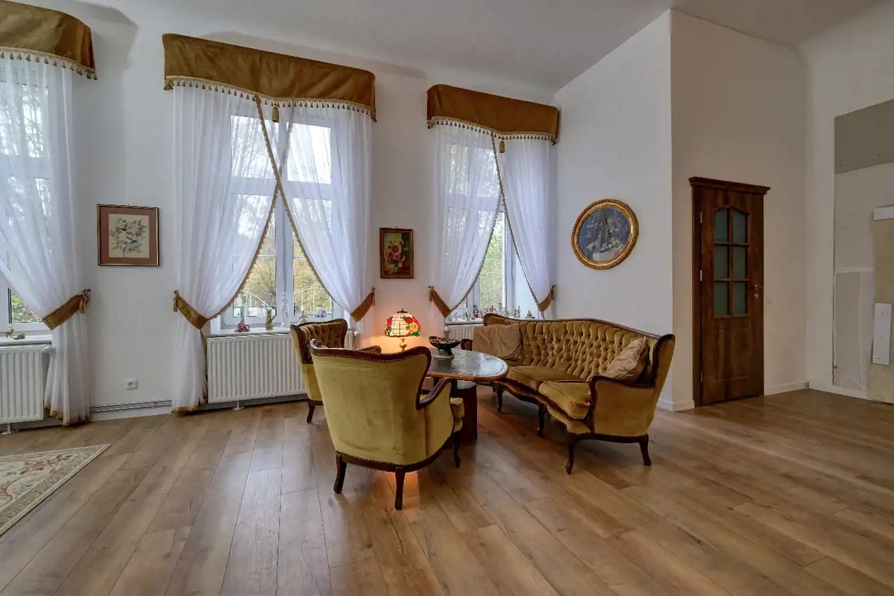Mieszkanie 74,08 m2 położone jest na parterze, w pałacu w Starnicach w gminie Dębnica Kaszubska. Zespół parkowo-pałacowy pochodzi z XVIII wieku.